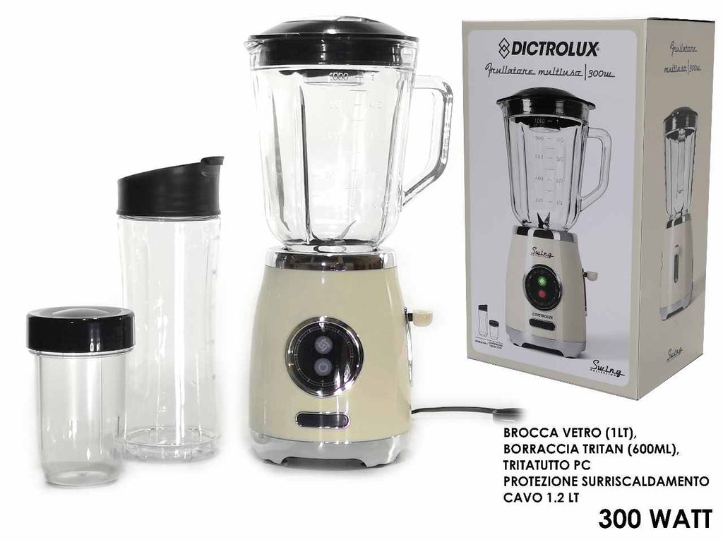 Frullatore multiuso, 300w, brocca in vetro 1lt, borraccia tritan 600ml, tritatutto pc, protezione surriscaldamento, cavo da 1,2mt