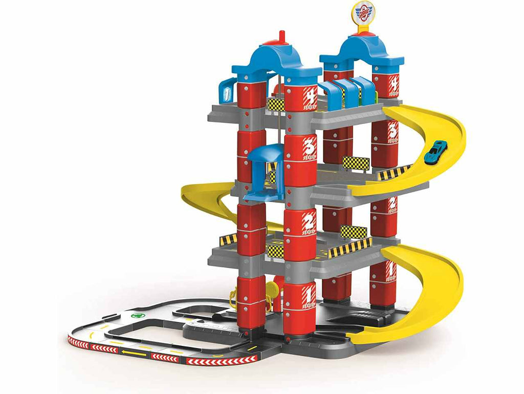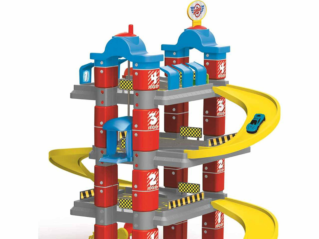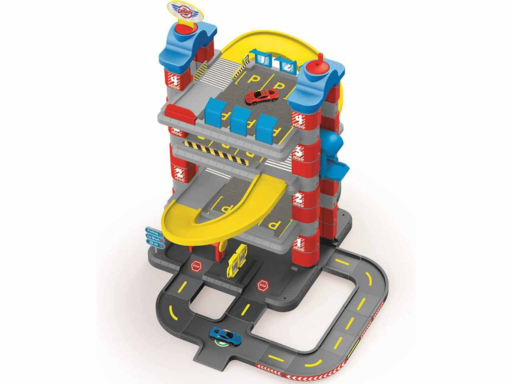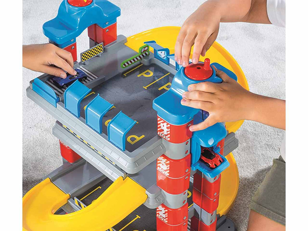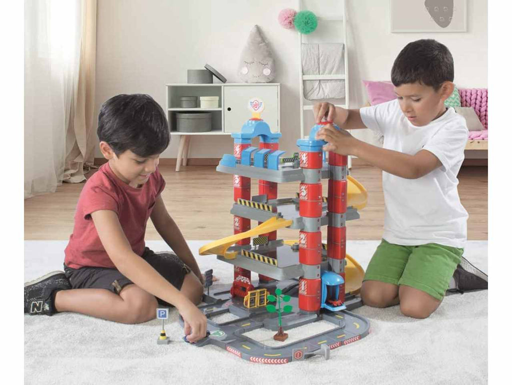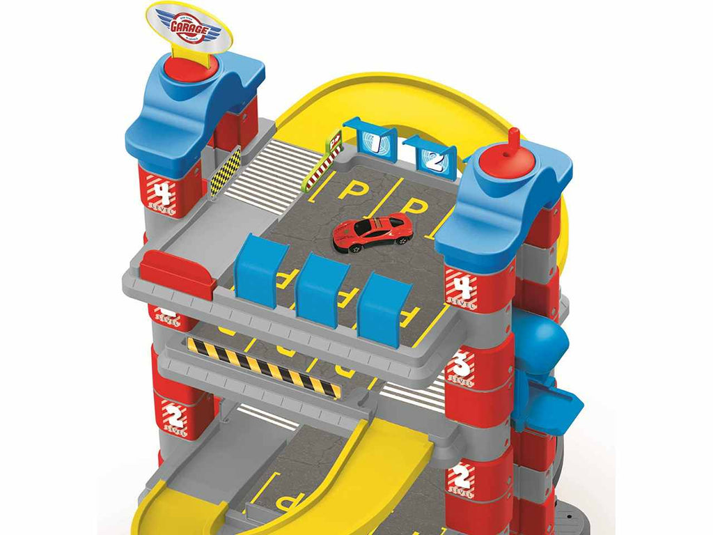 à adatto per bambini dai 36 mesi e oltre. le dimensioni sono 71 x 62,5 x 56 cm. sono incluse due auto metalliche ed ha lascensore. sviluppa la fantasia e i giochi di ruolo.
