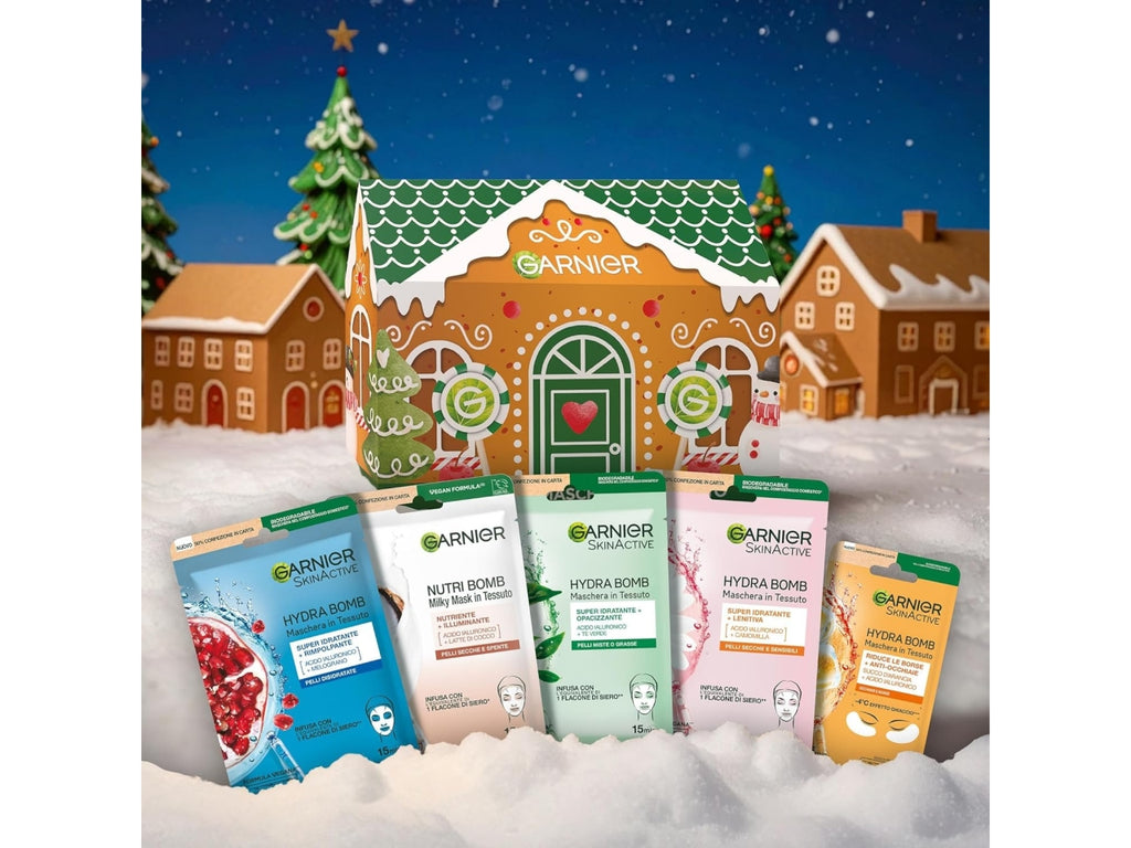 Cofanetto Garnier Natale Casa Pan di Zenzero con 5 Maschere in tessuto per ogni esigenza della pelle, Maschera Viso Hydra Bomb Melograno, Camomilla e Tè Verde, Maschera Viso Nutri Bomb Latte di Cocco e Maschera occhi anti-occhiaie