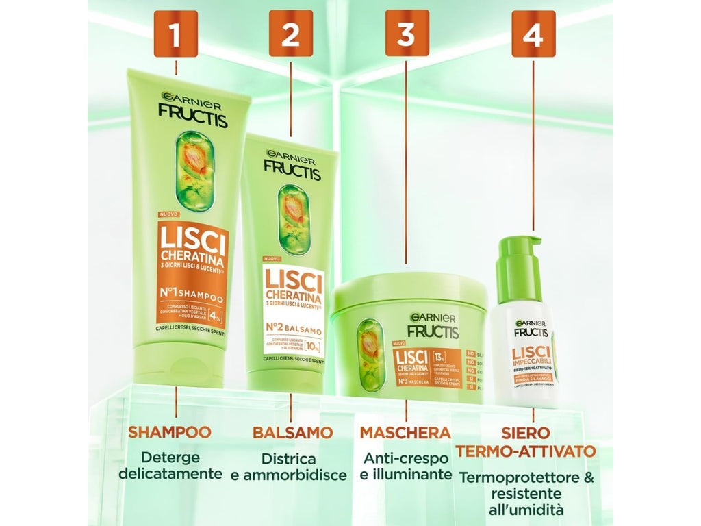 Shampoo Lisci Cheratina con complesso lisciante, Ispirato ai trattamenti liscianti alla cheratina, Ideale per capelli crespi, secchi e spenti, districa e ammorbidisce. Formula con cheratina vegetale che liscia e dona luminosità alla fibra del capello, Arricchita con olio di argan che rende il capello morbido, nutrito e setoso.