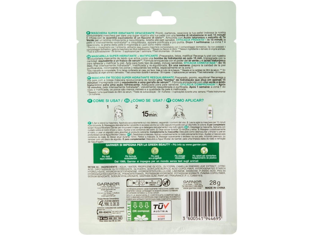 Il tessuto è imbevuto in un trattamento idratante ri-equilibrante. Efficacia constatata, in 15 minuti la pelle è re-idratata, ri-equilibrata e ri-opacizzata. In una settimana mento, fronte e naso sono opacizzati, la grana della pelle appare migliorata e i pori sono purificati. Vera e propria innovazione, il suo tessuto è imbevuto di un trattamento idratante ri-equilibrante. Formula con estratto di tè verde, acido ialuronico e siero idratante. Ottimo per le pelli miste o grasse è adatta anche alle pelli sensibili.