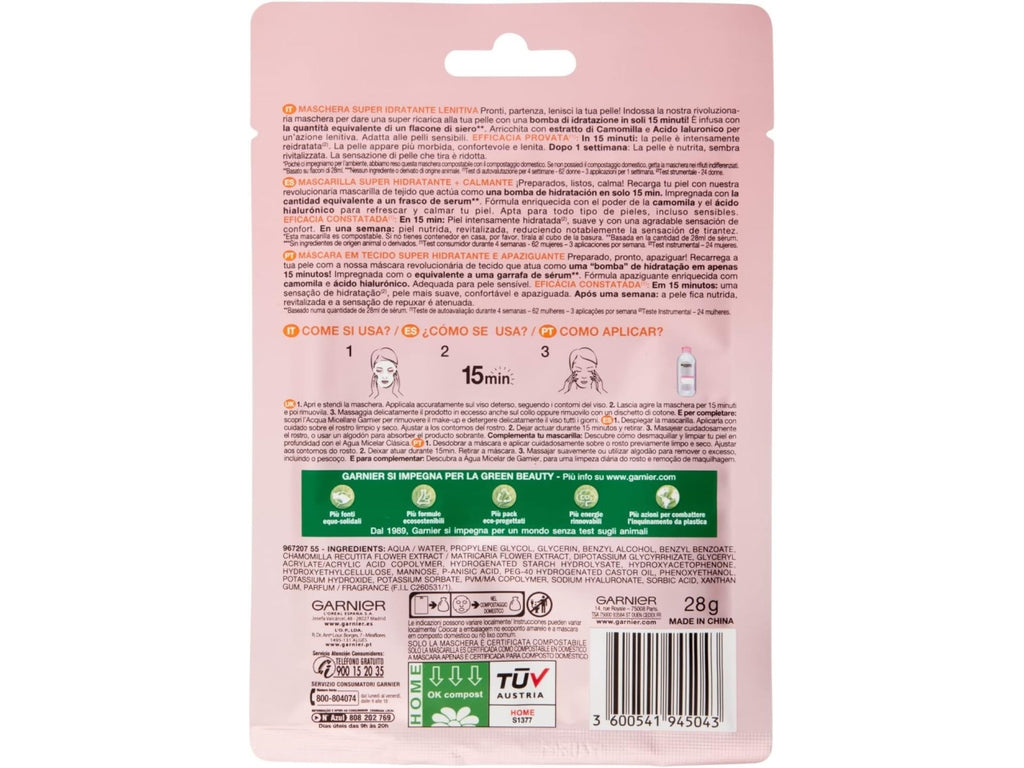 Il tessuto è imbevuto in un trattamento super idratante lenitivo. Arricchito con estratto di camomilla, acido ialuronico e siero idratante. Efficacia constatata, in 15 minuti la pelle è re-idratata, morbida e con una piacevole sensazione di comfort. In una settimana la pelle è nutrita, rivitalizzata e la sensazione di pelle che tira è alleviata.