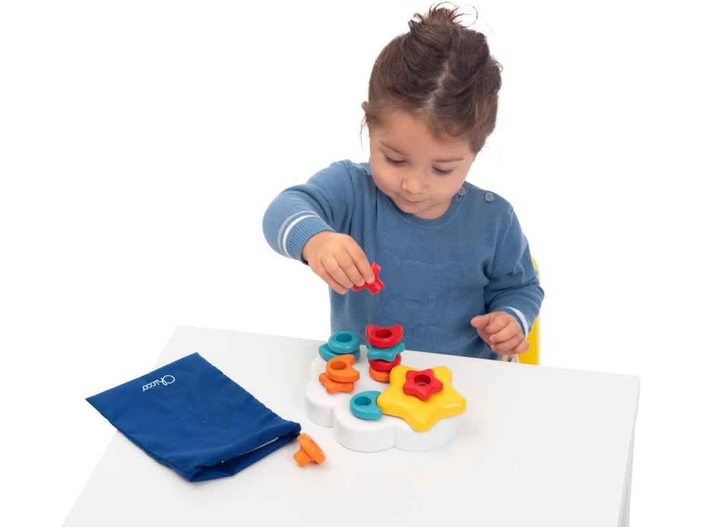 Un nuovo concetto di gioco per divertirsi con chiodini, forme e colori! Crea la tua composizione e libera la tua immaginazione. 16 pezzi inclusi: 1 base per nuvola, 1 grande stella, 12 chiodini colorati, 2 cartoncini stampati fronte e retro, 1 sacchetto di stoffa per riporre tutti i chiodini. Due modalità di gioco: GIOCO LIBERO e SEGUI LA SEQUENZA GIOCO LIBERO: i bambini possono giocare impilando i chiodini sullâarcobaleno nellâordine che preferiscono, stimolando la psicomotricità fine e la creatività .