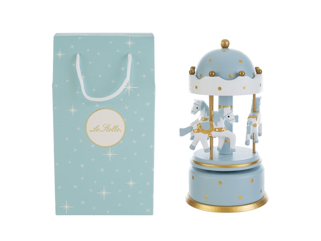 Un raffinato carillon in legno dal colore celeste, perfetto per celebrare momenti speciali. Con le sue dimensioni compatte di 10,5×21 cm e la shopper inclusa, è ideale come bomboniera per una nuova nascita o un battesimo. Un tocco delicato che conserva ricordi preziosi.