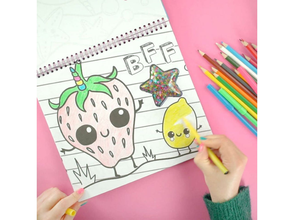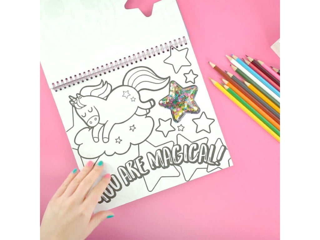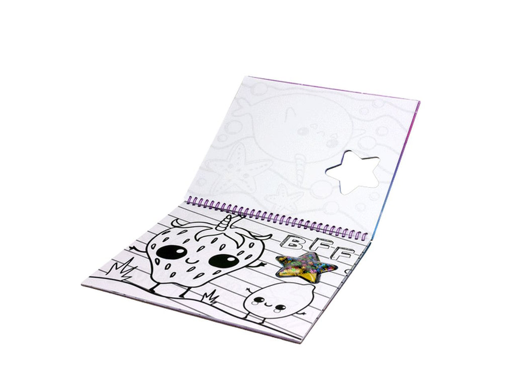 Libro da disegno con immagini da colorare. il blocco è decorato con una stella di glitter scintillante che ritroverai al centro di ogni pagina. allinterno tantissime bozze con simpatici personaggi. oltre a colorare potrai aggiungere soffici adesivi alle tavole.il libro contiene 20 tavole e una pagina di adesivi. potrai portarlo dove preferisci, è un ottimo strumento per fantasticare e non annoiarsi!