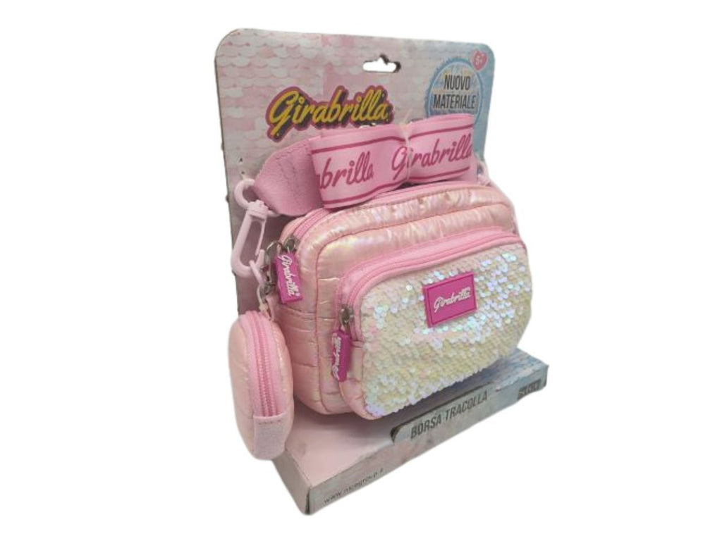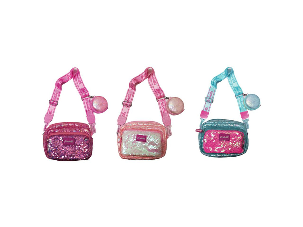 Borsetta pochette con tracolla e porta monete. tessuto puffer e tasca con paillettes reversibili. disponibile in 3 colori.