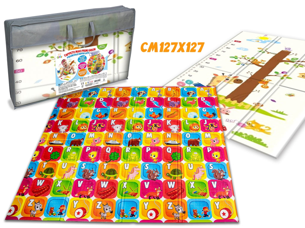 Tappetto pieghevole con doppia lato: lettere, disegni di animali/oggetti e il metro per misurare l'altezza. Non contiene sostanze tossiche, nocive o irritanti. Il tessuto è morbido, adatto ai bambini di tutte le etÃ