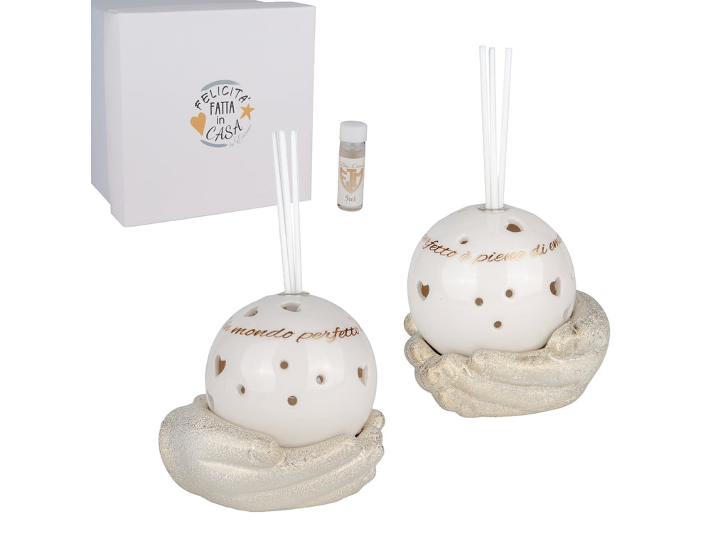 Gold illumina sfera diffusore bianco con bastoncini, led e profumo su mani oro 10cm, 2assortimenti