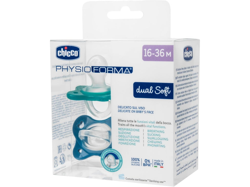 Dual Soft gommato realizzato in 100% silicone, un materiale igienico e indeformabile, scelto per la sua praticità . L'esclusiva finitura SOFT SENSE lo rende morbido e vellutato. Elegante e bicolore. Il nuovo gommotto Chicco dal design esclusivo. Il comfort del nuovo scudo sottile e compatto incontra PhysioForma, l'esclusiva tettarella Chicco. Lascia spazio alla naturale posizione della lingua e ne distribuisce la pressione sul palato in modo uniforme. L'esclusiva PhysioForma del gommotto Chicco aiuta a posizionare la lingua in avanti e in alto lasciando aperte le vie aeree.