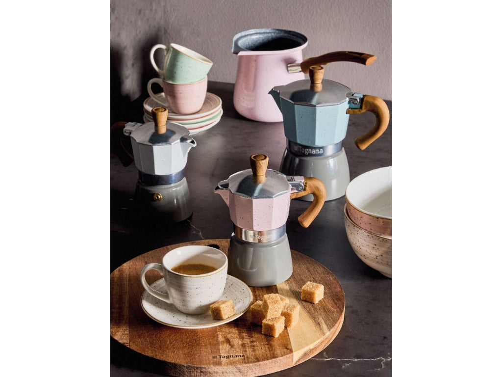 Caffettiere con Manico con finitura soft touch effetto legno, mantiene caldo il caffè. Manico ergonomico ed antiscivolo. Risparmio energetico. Non adatto all'induzione, ma adatto al lavaggio in lavastoviglie.