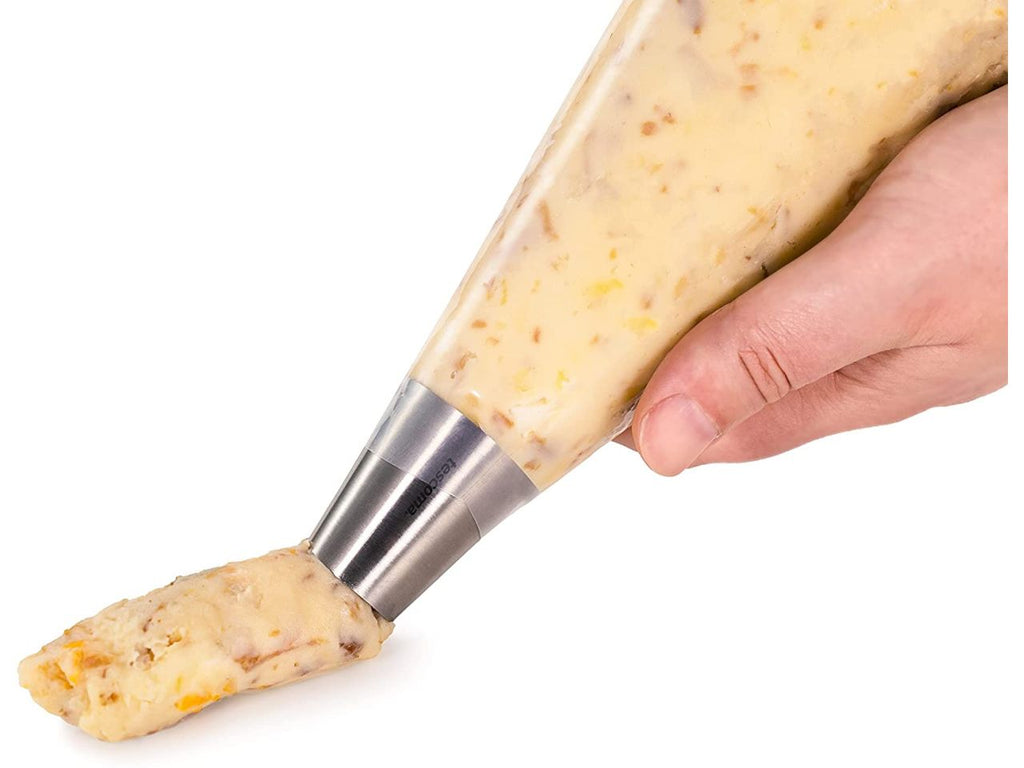 La sac à poche non si usa solo per i dolci o per decorare: questo kit per esempio ti aiuta a dare forma a deliziose preparazioni salate. I due beccucci in acciaio con bocchetta larga, uno liscio e uno a stella, servono per preparare rispettivamente crocchette cilindriche e con la caratteristica forma scanalata. La sac à poche in dotazione è perfetta per contenere gli impasti. Non ti resta che seguire le ricette in dotazione per preparare squisite crocchette al prosciutto e deliziose e scenografiche patate duchessa. Sarà facilissimo! Trovi anche le sac à poche di ricambio, acquistabili separatamente con il codice 630469. Dimensioni: ø beccucci 3,5 cm, beccuccio liscio: ø bocchetta 2,5 cm - altezza 4 cm, beccuccio a stella altezza 5 cm, sac à poche lunghezza 50 cm