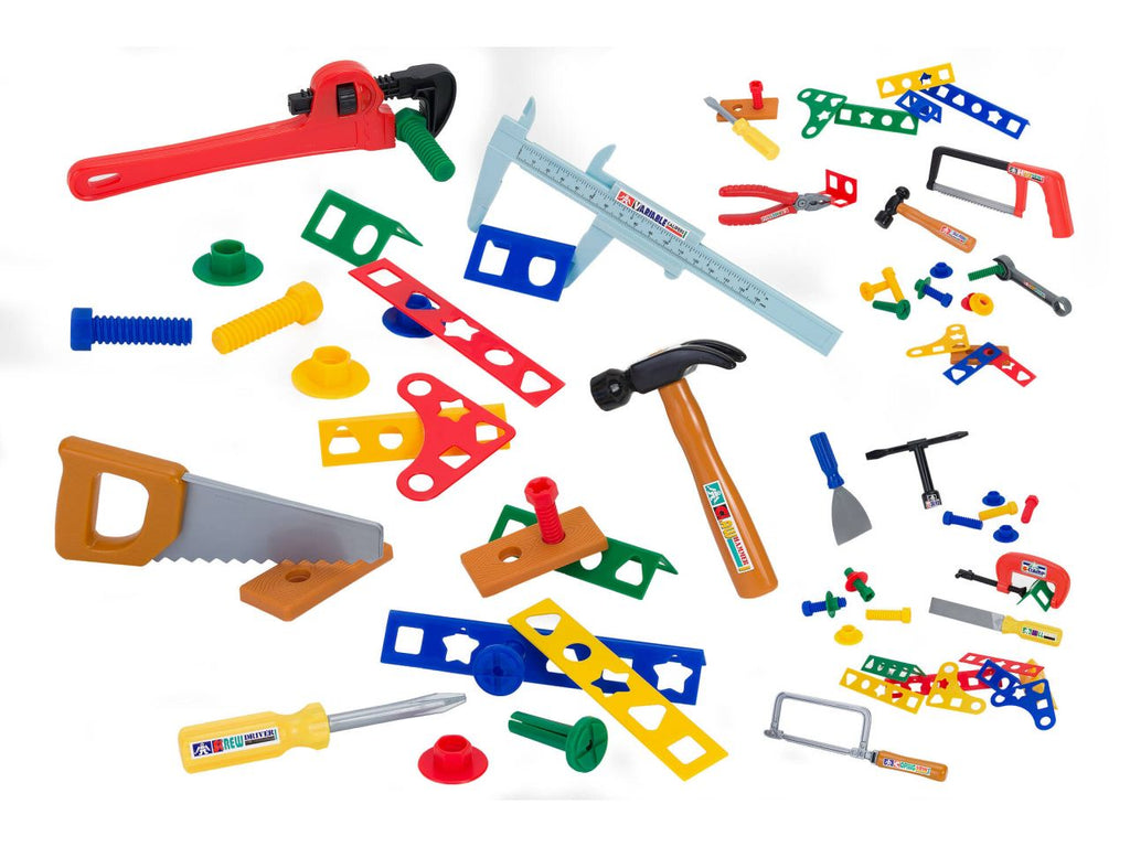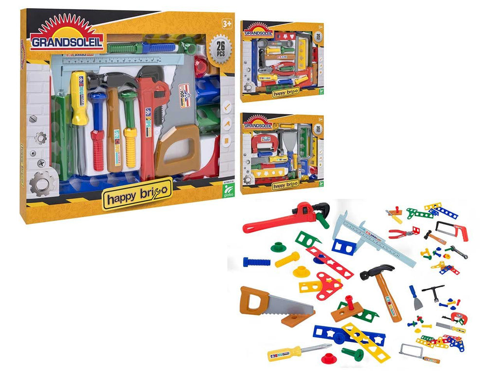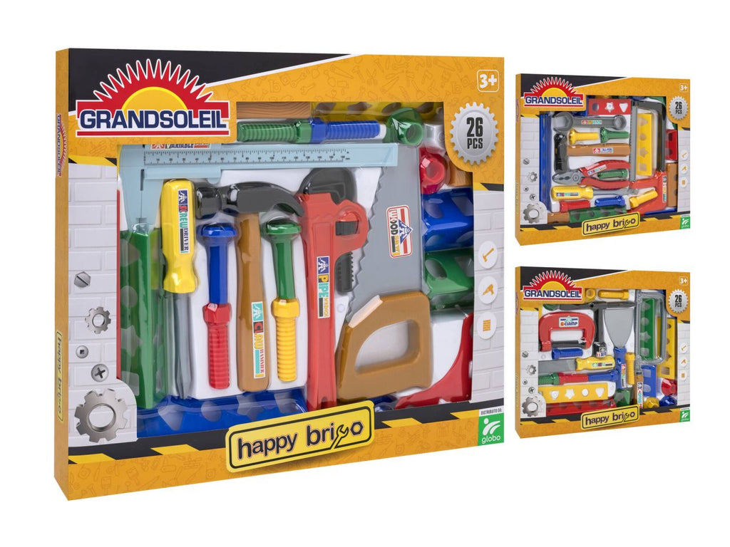 Set completo di tanti attrezzi da lavoro giocattolo per i piccoli carpentieri di domani. martello, sega, cacciaviti, brugole e molto altro da scoprire per il tuo divertimento. 26 accessori inclusi. disponibili 3 set assortiti.