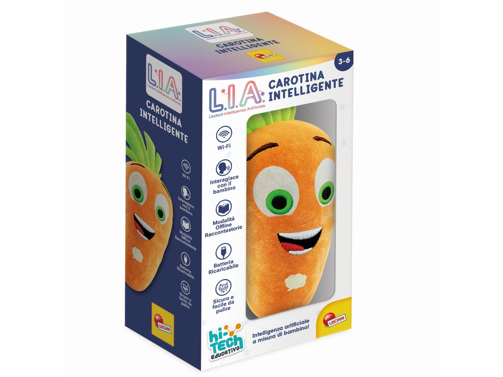 L.I.A. incontra Carotina! Un peluche in grado di dialogare in tempo reale con il bambino, rispondendo alle sue domande e proponendo tante attività e contenuti educativi e di approfondimento. Carotina Intelligente ricorda i giochi e le conversazioni avute con il bambino, impara sempre nuove cose e interagisce in modo sempre più preciso e stimolante!