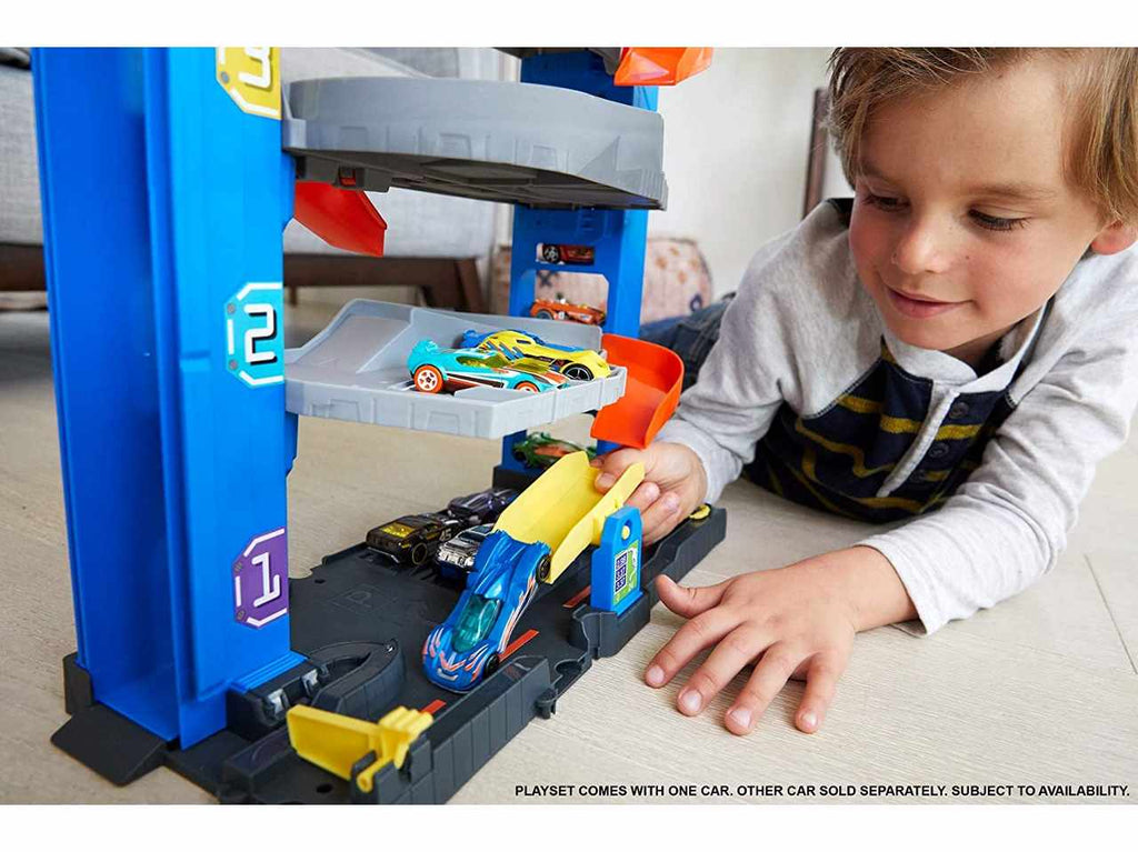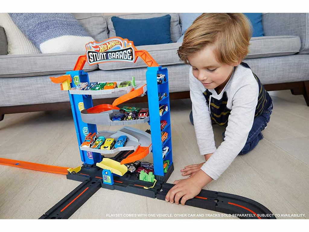 Il playset hot wheels city garage delle acrobazie 㨠l'unico garage in cui i bambini possono far saltare le auto da un piano all'altro! prendi l'ascensore per portare le auto a qualsiasi piano tu voglia e scegli se parcheggiare l㬠o cominciare a fare acrobazie, saltando al piano inferiore. con i commutatori, i piccoli possono guidare la loro auto fino a un particolare piano oppure possono recarsi al piano terra per una revisione totale della vettura. fai il pieno di carburante e assicurati che l'auto sia pronta per la prossima avventura! ogni playset hot wheels city si collega direttamente agli altri e alle piste city grigie ed 㨠comunque compatibile con le classiche piste arancioni. hot wheels® garage delle acrobazie