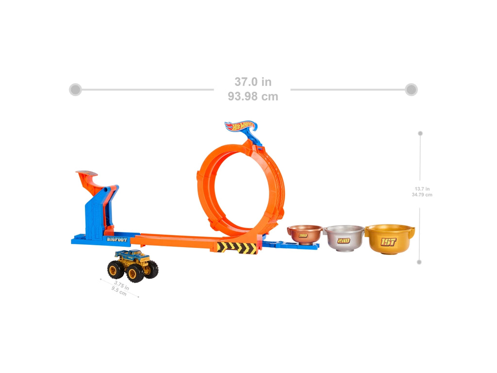 Celebra il 50 anniversario di Bigfoot con il playset Hot Wheels Monster Trucks Sfida Trofeo Gira e Capovolgi! Presenta due possibili configurazioni: Lancia Bigfoot in scala 1:64 in un loop completo prima di effettuare acrobazie nel trofeo, oppure inverti il loop per farle compiere una capriola all'indietro in uno dei trofei. I trofei variano a seconda delle dimensioni e del valore dei punti per aumentare la sfida e offrire modi diversi di giocare: atterra per primo in ogni coppa o totalizza il maggior numero di punti. Bigfoot die-cast sfoggia decorazioni esclusive per celebrare il suo 50 anniversario.