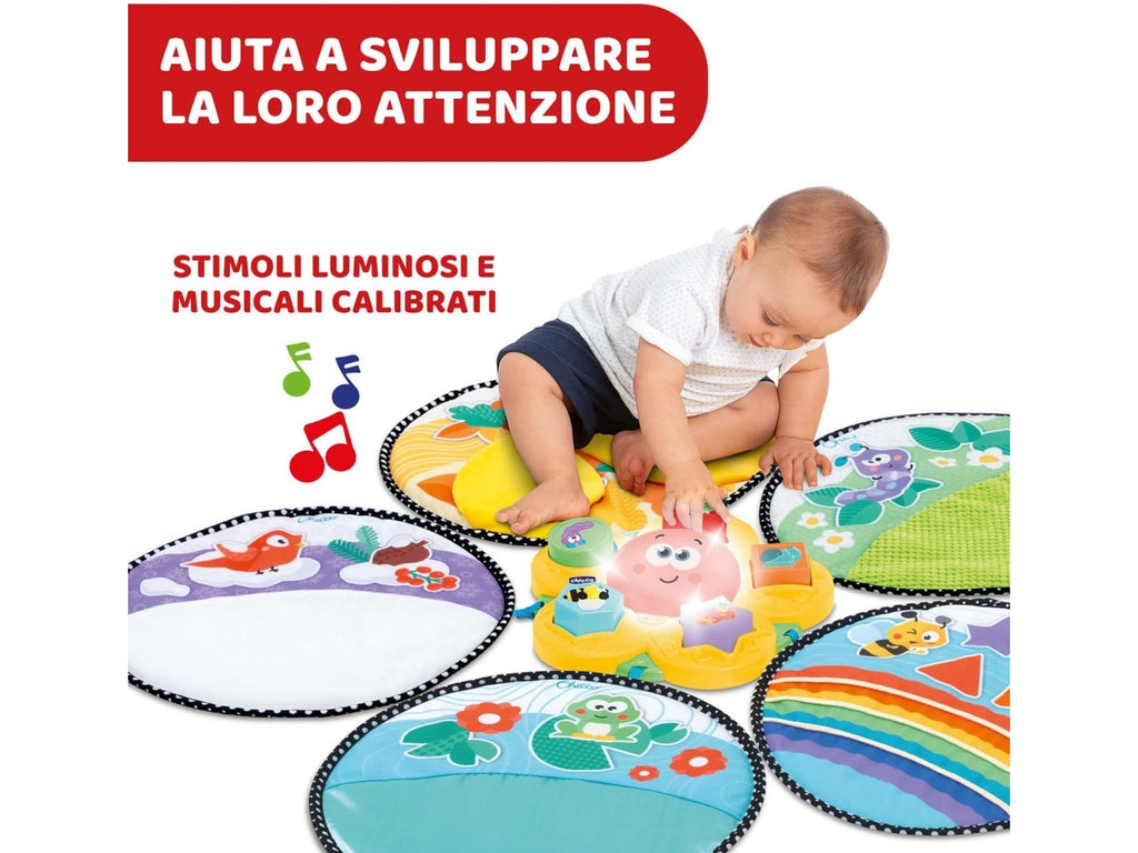Un percorso sensoriale da toccare, su cui gattonare e camminare; il suo fiore elettronico e i 5 morbidi tappetini aiutano a sviluppare l'attenzione e i sensi dei bambini con varie attività manuali. Gioco elettronico a incastro con 5 forme 3D raffiguranti animali; i fiori si illuminano con luci colorate ogni volta che la forma è inserita nel foro corretto. 5 tappetini morbidi che rappresentano le 4 sagioni e un arcobaleno, ogni tappeto presenta tessuti e stimoli sensoriali diversi per aiutare lo sviluppo di capacità specifiche del bambino. I tappetini rotondi in tessuto possono essere attaccati sia al fiore centrale sia tra loro, per creare più di 10 configurazioni, stimolando fantasia e creatività . Il Sentiero delle stagioni si arricchisce di stimoli musicali e luminosi per aiutare il bambino a sviluppare la propria capacità di concentrazione e concentrarsi sulle attività ludiche. Il suono può essere disattivato sul tappetino da gioco, per aiutare il bambino a focalizzare l'attenzione solo sugli stimoli luminosi e sulle attività manuali che vengono eseguite.