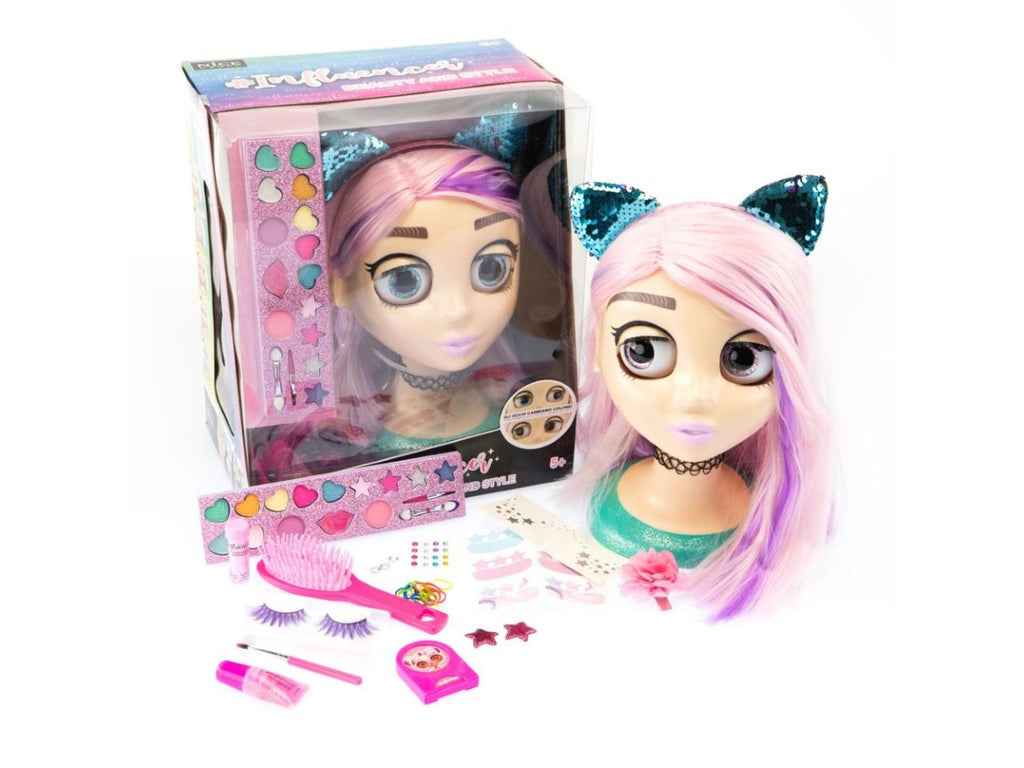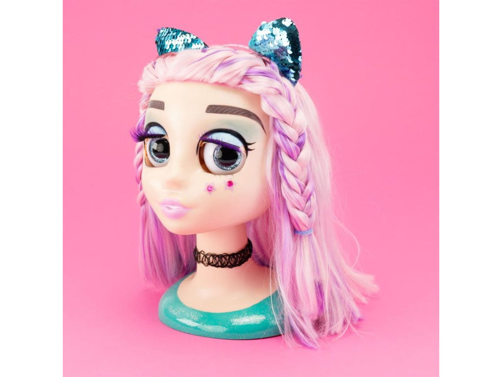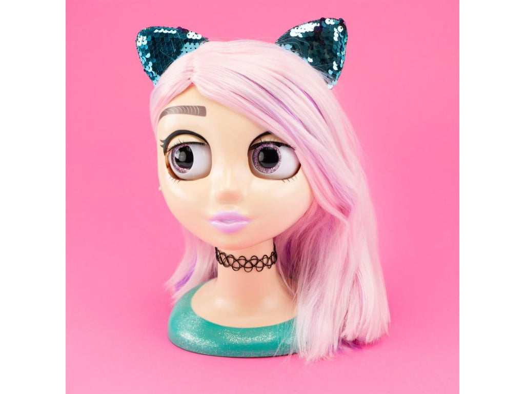 Testa di bambola con capelli lunghi 30cm provvista di un meccanismo a leva che permette di selezionare tra 4 colori di occhi oltre ad una base con ventose per bloccarla sulle superfici lisce.nella confezione è presente un ricchissimo kit di bellezza da utilizzare sulla bambola ma anche sulla pelle: 1 collanina, 1 cerchietto con orecchie, 1 gesso colorato per capelli, 1 tubetto di glitter per capelli, 1 pennello per cosmetici, 1 foglio di adesivi per occhi e viso, 2 ciglia finte, 1 foglio di tatuaggi provvisori olografici, 1 spazzola per capelli, elastici per capelli, 1 molletta per capelli a forma di fiore, 2 stelline al velcro per capelli, 1 boccetta di polvere shimmer, 1 foglio di gemme adesive, 1 vassoio di trucchi con applicatore e pennellino.