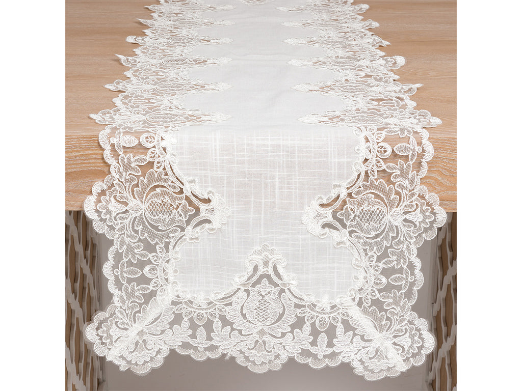 100% poliestere, bianco con pizzo intorno, misure articolo: 45x140cm