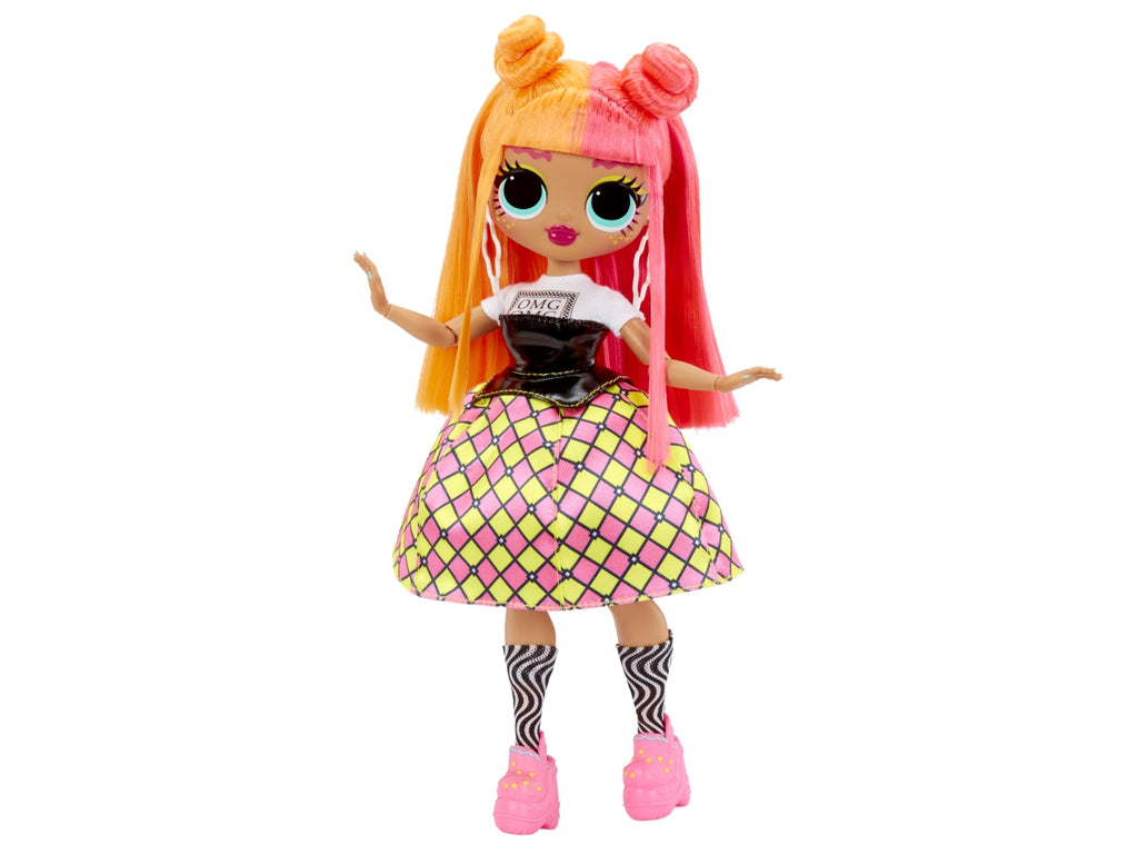 Le originali bambole alla moda l.o.l. surprise o.m.g. sono tornate in una nuova veste glamour e con bellissime acconciature: saluta neonlicious, la sorella maggiore del personaggio elettrico neon q.t.! neonlicious è una stilista che ama la moda e i colori vivaci, le luci brillanti e l'energia! scopri le numerose sorprese, tra cui la trasformazione degli abiti e i favolosi accessori, dagli occhiali da sole ai simpatici orecchini che mostrano il suo stile unico e colorato! vesti neonlicious con la sua camicia omg unica nel suo genere, il corsetto alla moda e la splendida gonna a scacchi! scopri l'ulteriore sorpresa alla moda di neonlicious togliendo la gonna per rivelare i pantaloncini colorati bicolore, trasformando istantaneamente il suo outfit in un look completamente diverso! questa riedizione di neonlicious mette in mostra i suoi splendidi lineamenti, lacconciatura, il suo accattivante outfit e linfinità  di pose che può assumere.ogni confezione include una bambola fashion l.o.l. s urprise o.m.g., abiti audaci, accessori, scarpe e un pettine per capelli! colleziona tutte le 4 bambole l.o.l. surprise o.m.g. nella nuova versione: swag, neonlicious, lady diva e royal bee!