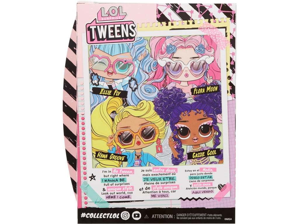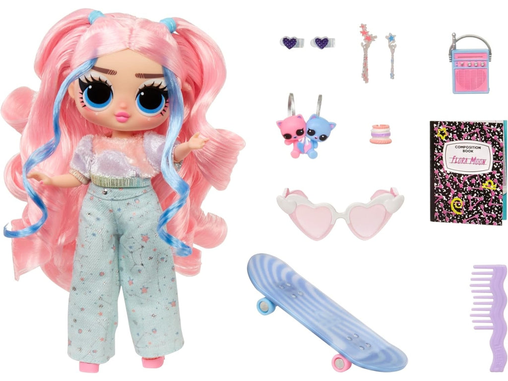 Flora Moon ha lineamenti straordinari, capelli rosa bellissimi, un outfit favoloso ed è venduta snodabile, così può assumere un'infinità di pose. Le piace seguire il proprio ritmo e vivere in maniera rilassata, che si tratti di fare un giro sullo skateboard o di uscire con gli amici. Vesti Flora scegliendo un outfit e degli accessori unici per sfoggiare uno stile leggero e stellato con il maglione viola, i jeans ampi e gli orecchini con le stelle, lo zainetto con due gattini e gli occhiali da sole a forma di cuore. Una fashion doll Tweens con outfit esclusivi, scarpe, occhiali da sole, borsetta, accessori, skateboard, radiolina e spazzola per capelli. Colleziona tutte e 4 le fashion doll LOL Surprise Tweens: Hana Groove, Flora Moon, Cassie Cool ed Ellie Fly.