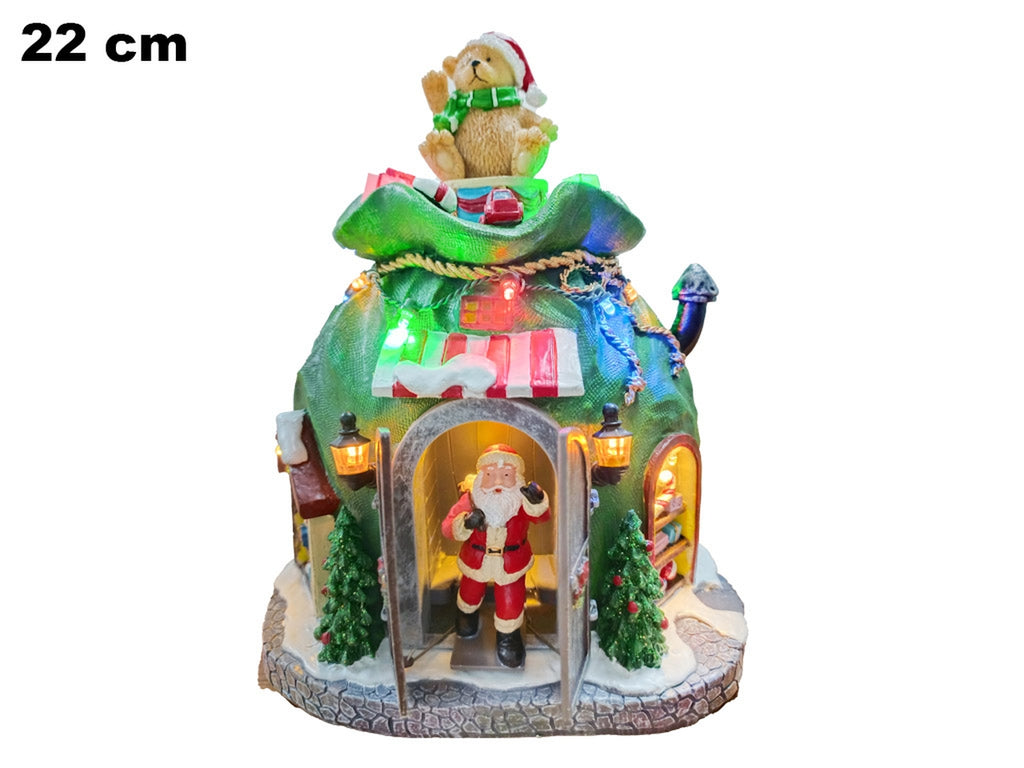 Il "Laboratorio di Babbo Natale" è una decorazione natalizia alta 22 cm che presenta luci e musica. Questa rappresentazione del laboratorio di Babbo Natale è caratterizzata da una figura di Babbo Natale all'entrata, pronto per accogliere gli ospiti. Sulla parte superiore della struttura, è presente un grande sacco di regali con un tenero orsetto natalizio, aggiungendo un tocco festivo e accogliente. Le luci colorate illuminano l'intera scena, creando un'atmosfera calda e gioiosa, perfetta per arricchire la decorazione natalizia della casa. La musica integrata aggiunge un elemento sonoro, rendendo questo laboratorio animato un pezzo distintivo per le festività .