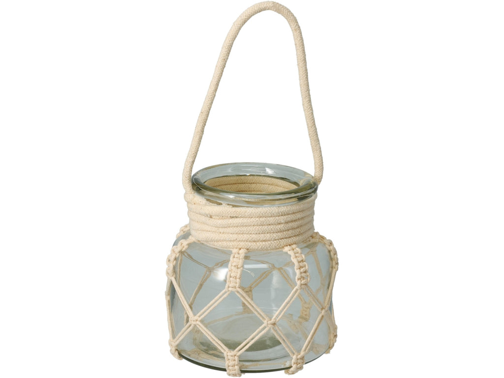 Lanterna con corda di cotone in vetro, dimensioni: 12x12cm, peso: 430 grammi, colore naturale, con manico in corda.