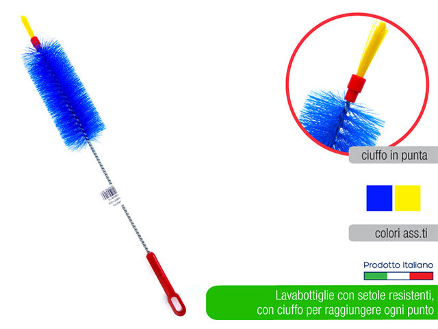 Lavabottiglie con ciuffo realizzato con setole molte resistenti. pratico per pulire a fondo e senza fatica i bottiglie. all'estremità  un foro permette di appendere il lavabottiglie. lunghezza 15 cm, diametro 6 cm.