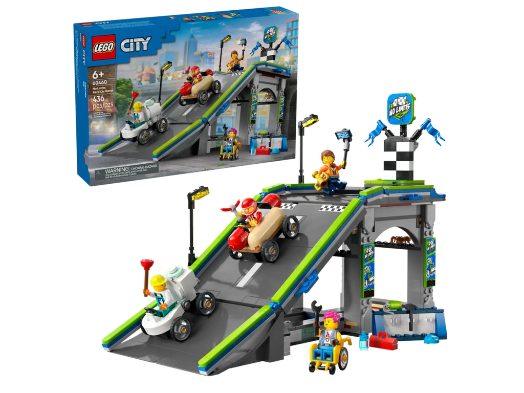 Aumenta lâentusiasmo ludico dei tuoi bambini con il giocattolo Nessun limite: gara sulla pista a rampe (60460) per bambini dai 6 anni in su. Questo dinamico set da corsa contiene unâimponente rampa per auto giocattolo e 2 esclusive macchinine. Guarda come i bambini posizionano le macchinine dellâhot dog e del WC in cima alla rampa e azionano una leva per farle sfrecciare dalla linea di partenza. Completo di 4 minifigure, tra cui i guidatori â il venditore di hot dog e lâidraulico â questo set ispira il gioco di fantasia e la narrazione di storie. Questo kit con macchinine LEGO include una guida alla costruzione stampata. I bambini possono anche vivere una divertente avventura di costruzione con lâapp LEGO Builder, dove possono ingrandire, ruotare i modelli in 3D, monitorare i loro progressi mentre costruiscono ed esplorare e salvare altri set di gioco. I playset LEGO City offrono fantastici veicoli, strutture realistiche e personaggi divertenti per il gioco senza limiti. I bambini possono aggiungere questo set di macchinine ad altri (disponibili separatamente) della gamma LEGO City per espandere il mondo delle possibilità di gioco.