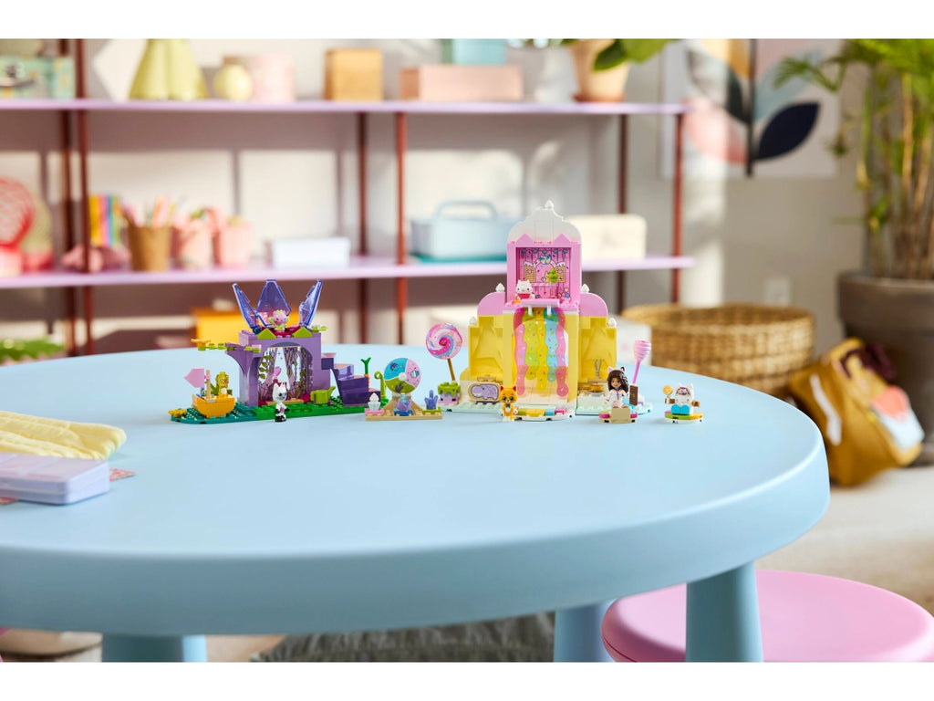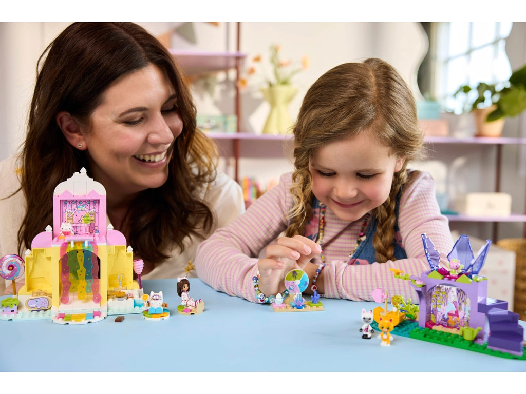 Il set da gioco creativo comprende 2 ambientazioni del film e numerosi personaggi LEGO, tra cui Gabby, Pandy Panda e Gattina Fatina. Nella Dolce montagna i più piccoli troveranno un magico mondo di dolciumi. I personaggi possono scivolare attraverso la cascata colorata su ciambelle galleggianti e il Giardino dei Gattini è un rifugio fantastico dove Gattina Fatina siede sul suo trono di fiori di cristallo e dove i bambini possono trovare tante gemme nascoste. Istruzioni colorate, un grande Starter Brick e sacchetti separati con 1 modello ognuno, rendono l’esperienza creativa veloce e divertente per i piccoli costruttori.