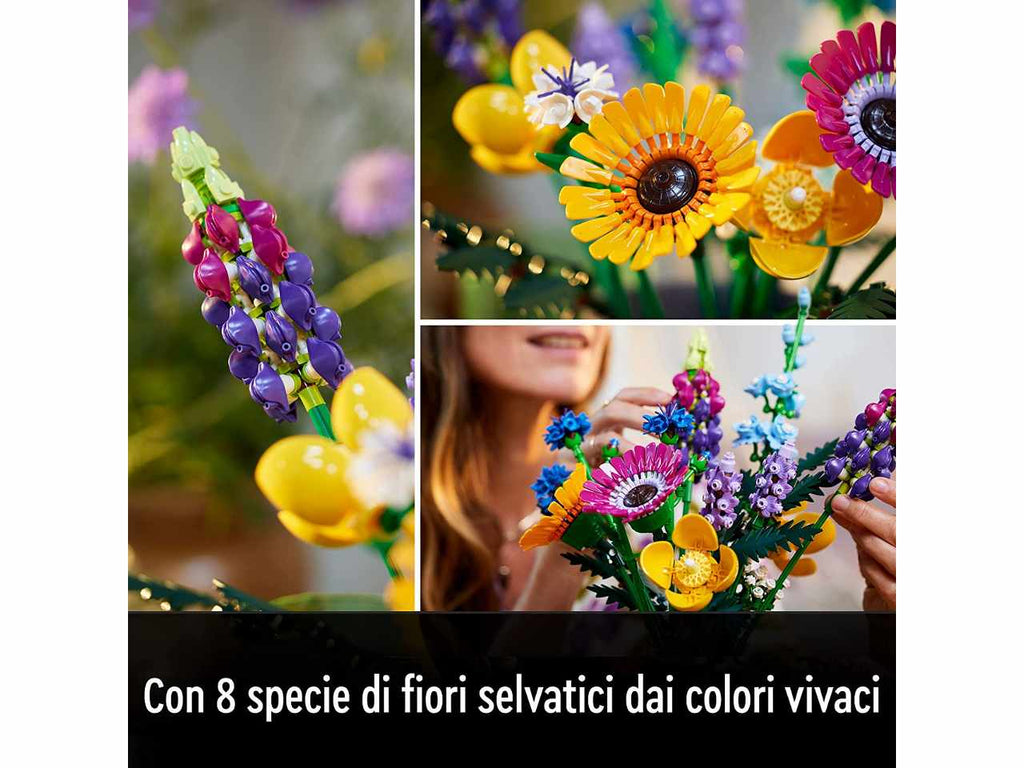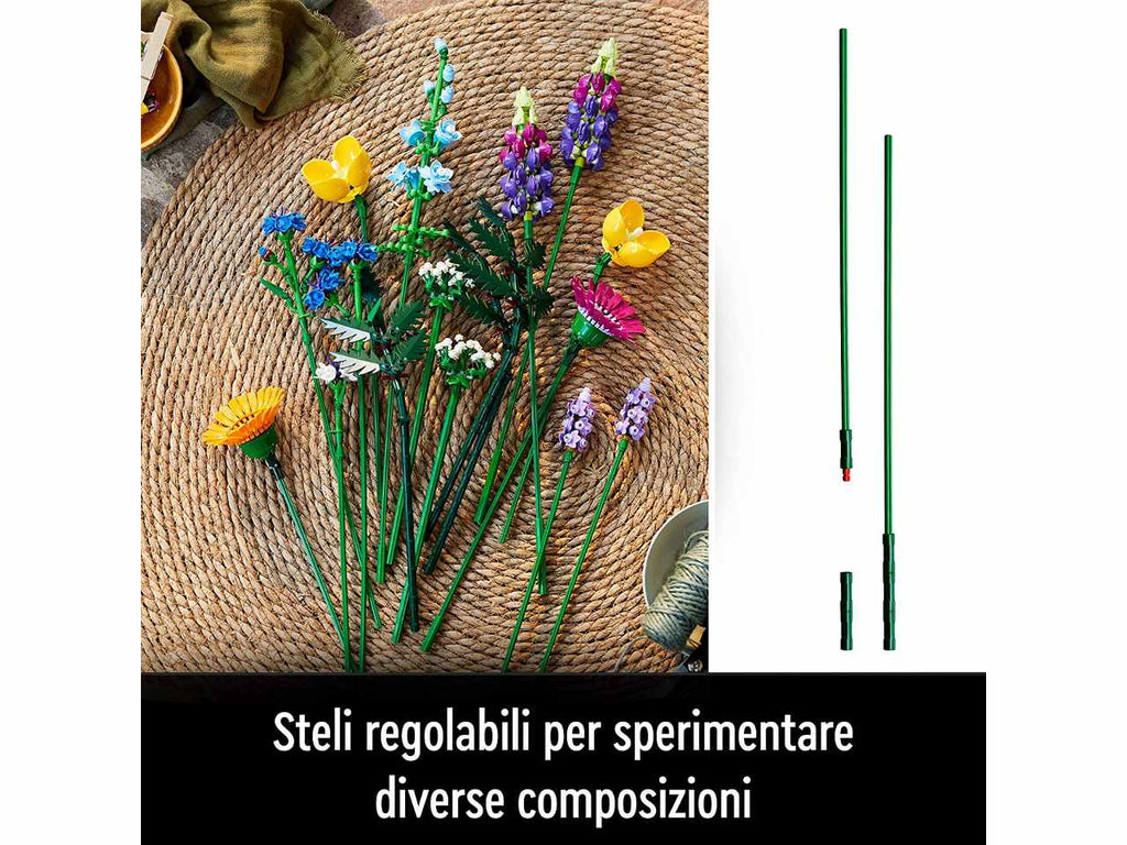 Bouquet fiori selvatici finti con papaveri e lavanda artificiali, hobby creativo per adulti, idea regalo per la casa, botanical collection Lasciate sbocciare la vostra creatività con il vivace set LEGO Icons il Bouquet Fiori Selvatici, dotato di 8 diverse specie di fiori finti con cui realizzare un accattivante bouquet personalizzato da esporre Questo set di fiori LEGO include 16 steli con un mix di specie floreali, come fiordalisi, lavanda, papaveri del Galles, prezzemolo, felci, gerbere, speronelle e lupinelle I fioristi in erba e i fan dell'arte floreale, possono adattare l'altezza dei fiori artificiali LEGO e sperimentare diverse composizioni grazie ai 16 steli regolabili, per creare il proprio allestimento unico Questo bouquet di fiori finti non appassisce e non deve essere mai annaffiato! Un meraviglioso hobby creativo fai da te, perfetto per essere messo in un vaso ed esposto come decorazione di casa Questo set LEGO Icons per adulti fa parte della Botanical Collection di fiori e piante LEGO, ispirata al mondo reale, e include elementi in plastica di origine vegetale, prodotta da canna da zucchero di origine sostenibile Un tocco di creatività per un regalo senza tempo grazie al set di fiori LEGO Icons; un'idea regalo di compleanno, o per un giorno speciale,ottima per sorprendere un amico o una persona cara