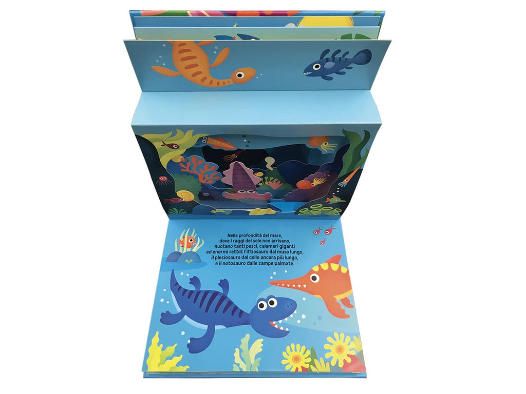 Uno speciale pop-up a tre livelli: su ogni pagina le coloratissime illustrazioni dei dinosauri si animano con un effetto spettacolare 3D, attraverso un raffinato meccanismo che dona profondità alle immagini. 8 pagine. Età di lettura: da 4 anni.