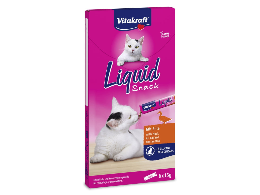 Un gustosissimo fuoripasto per il tuo tigrotto: Vitakraft Cat Liquid Snack con anatra e beta-glucani può essere somministrato in purezza, direttamente dalla mano, oppure per arricchire la razione di alimento e renderlo più appetibile. Grazie alla sua consistenza gelatinosa e al suo irresistibile gusto Cat Liquid Snack di Vitakraft è amatissimo dai gatti. Inoltre è privo di aromi, conservanti e coloranti artificiali. I beta-glucani rafforzano le difese immunitarie di Micio. I sei snack sono confezionati in pratiche bustine sigillate, contenute in una scatola di cartone rispettosa dell'ambiente. Con Vitakraft Cat Liquid-Snack con Anatra & Ã-glucani vizierai il gatto con una squisita ricetta, funzionale e facilmente porzionabile.