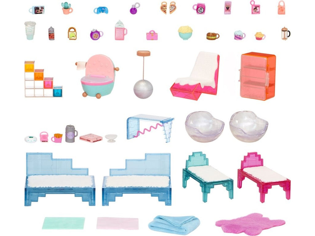 Date un'occhiata al soggiorno al primo piano, dove le bambole possono chiacchierare accanto al camino, rilassarsi su una delle poltrone o ballare sotto la palla da discoteca. Poi le bambole salgono la graziosa scala fino al secondo piano, dove si trovano una camera da letto completamente arredata e un bagno. La camera da letto è arredata con letti, mentre nel bagno troverete un water colorato e una graziosa panca. Al terzo piano, le bambole troveranno la cucina con un frigorifero e una vasta gamma di cibi deliziosi. Salta sulla terrazza sul tetto dove le bambole possono prendere lo ski lift che le porta dal primo al terzo piano.