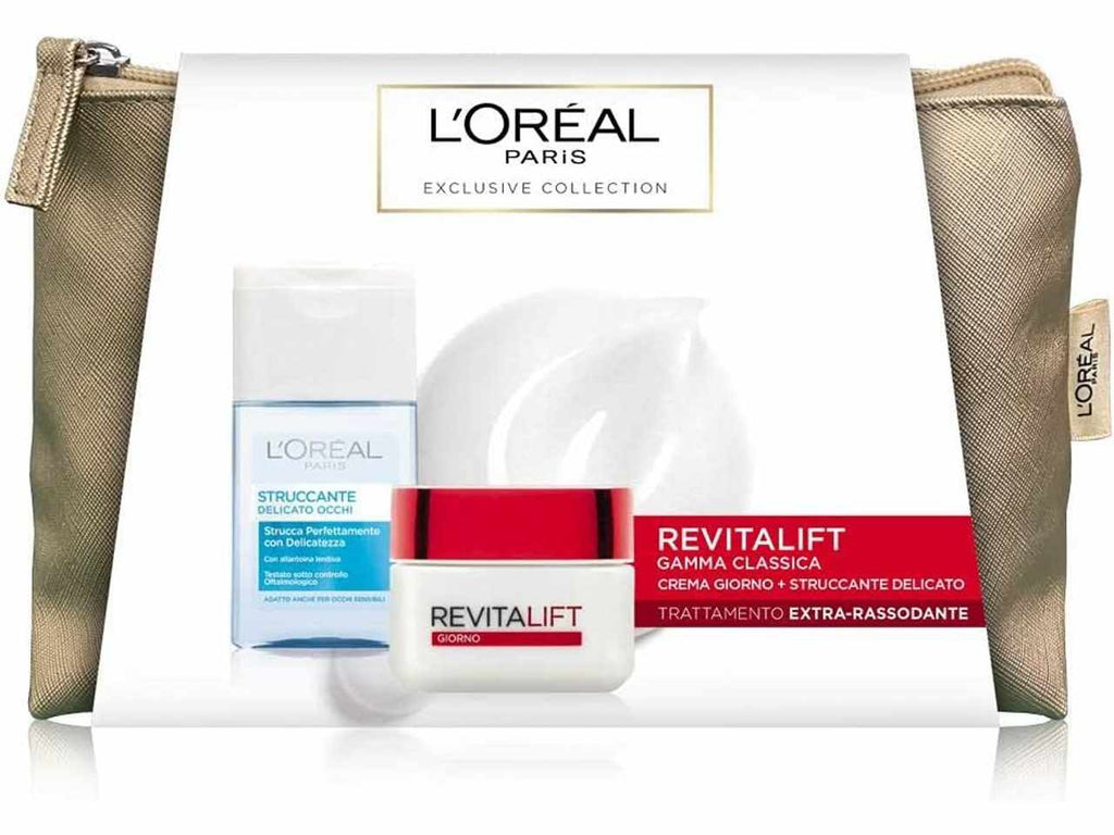 L'oréal paris pochette regalo con crema giorno anti-rughe revitalift e struccante waterproof, per una routine viso idratante e tonificante, 50 ml+125 ml Kit routine viso composto da crema giorno anti-rughe e struccante per rimozione del make-up waterproof, Struccante adatto ad occhi sensibili e portatori di lenti a contatto Viso pulito e libero dal make-up, Pelle idratata intensamente grazie alla crema viso rassodante, Pelle rinforzata e tonica con primi risultati visibili dopo 7 giorni di utilizzo, Rughe visibilmente ridotte in 4 settimane Struccante viso: applicare il prodotto su un dischetto di cotone e passarlo su tutto il viso con movimenti circolari fino a rimuovere ogni traccia di trucco dalla pelle, Crema viso: applicare tutti i giorni sul viso deterso con movimenti circolari ascendenti su viso e collo Struccante: formula ricca di oli delicati che non lascia residui grassi sulla pelle, Crema: arricchita con Pro-Retinolo avanzato per donare una pelle liscia e in Fibrelastyl per rafforzare la tonicità della pelle