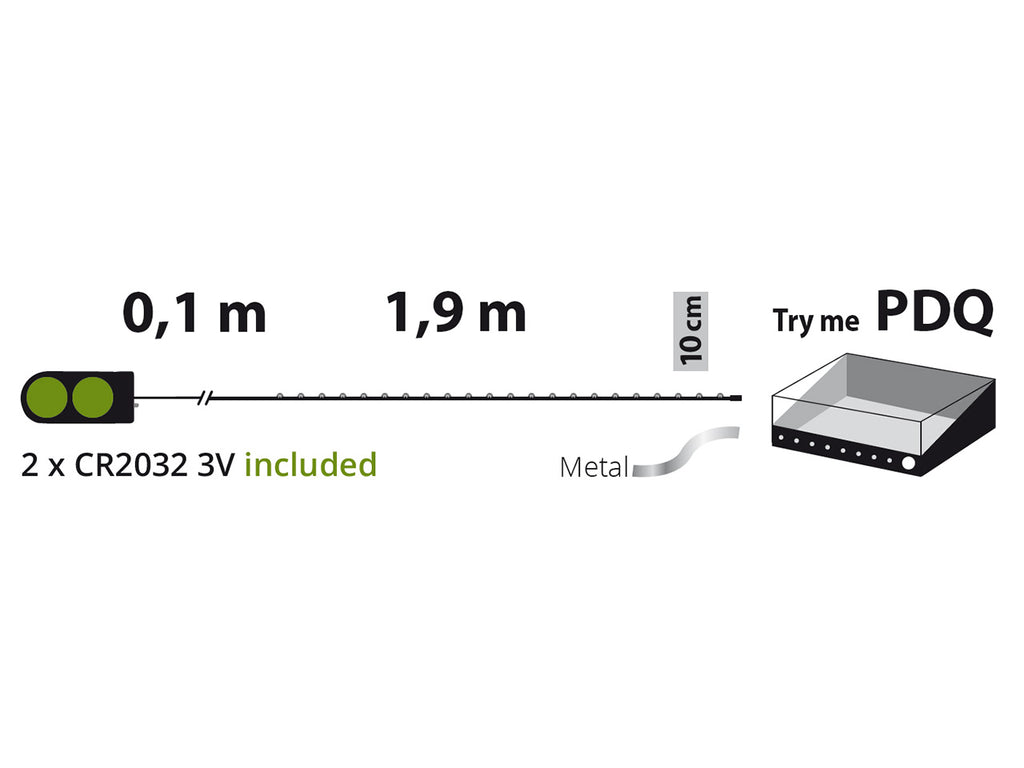 Catena lineare 2m 20 microled bianco caldo ø1,5mm, versione pdq, luce fissa, a batteria 2xcr2032 3v (incluse), micro porta batterie con selettore on-off, ip20 uso interno e portatile, cavo metallo argento metal silver, dimensioni 2m, scatola pvc color ed espositore pdq try me (xkc art. m20s cr2032 pdq).