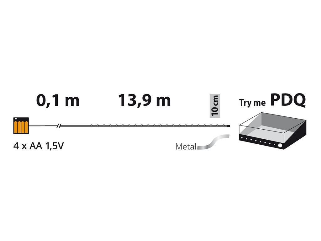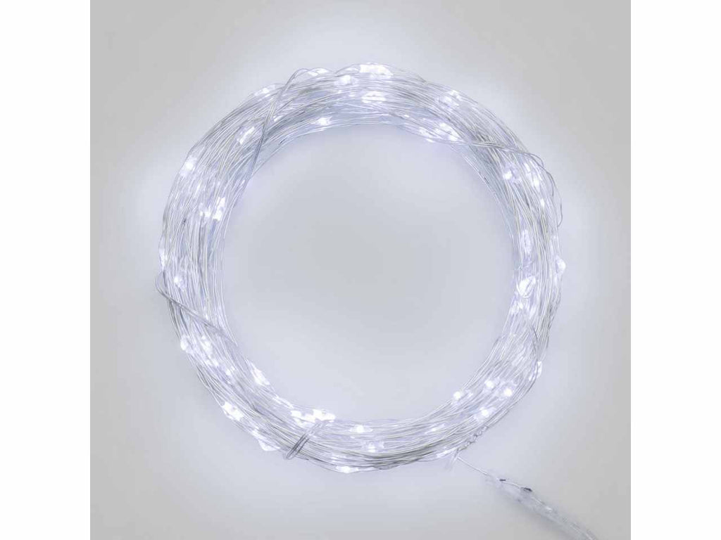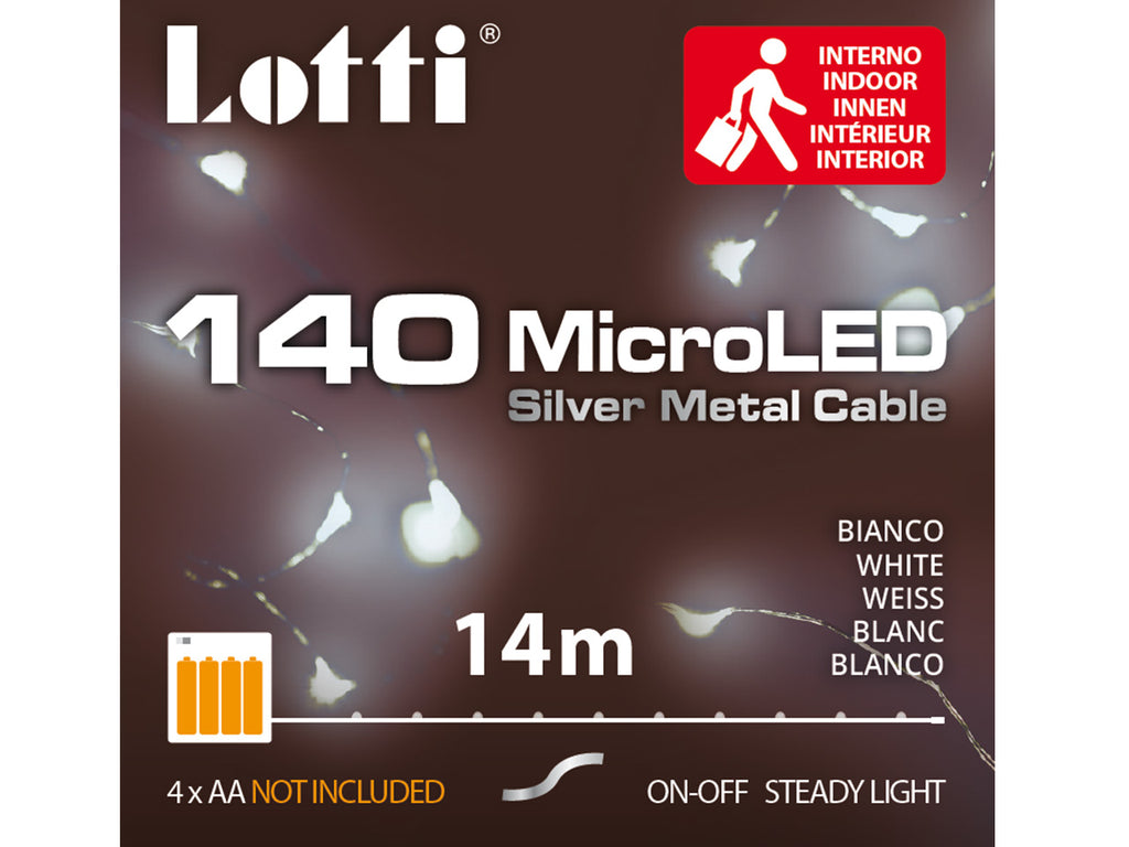Catena lineare 14m 140 microled bianco ø1,5mm, versione pdq, luce fissa, a batteria 4xaa 1,5v, porta batterie con selettore on-off, ip20 uso interno e portatile, cavo metallo argento metal silver, dimensioni 14m, scatola pvc color ed espositore pdq try me (xkc art. m140s 4aa pdq).