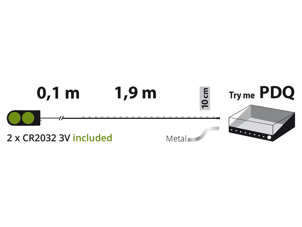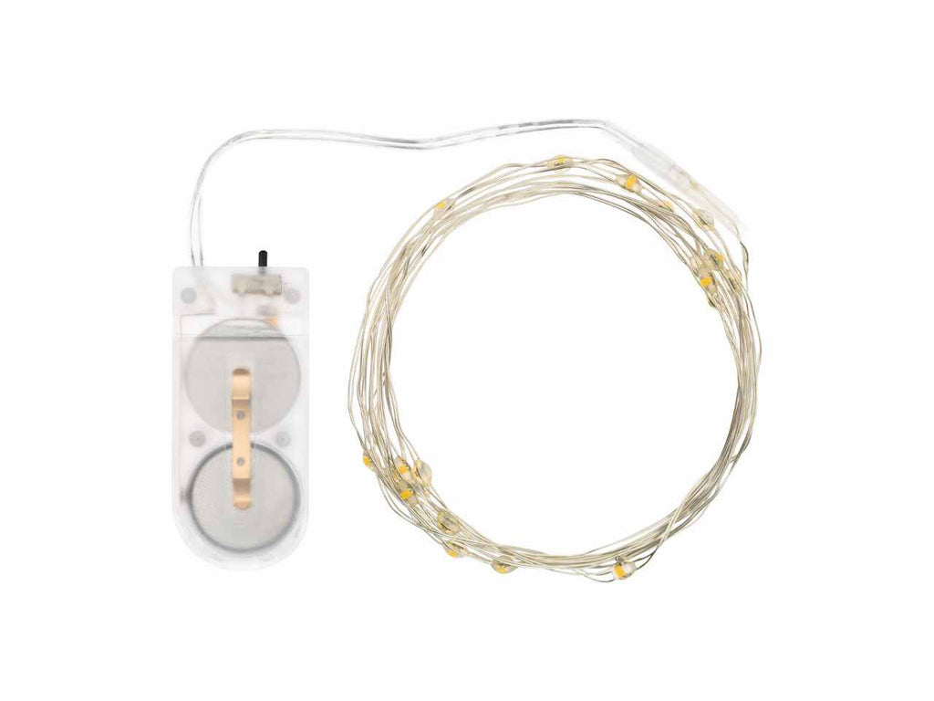 Catena lineare 2m 20 microled multicolor ø1,5mm, versione pdq, luce fissa, a batteria 2xcr2032 3v (incluse), micro porta batterie con selettore on-off, ip20 uso interno e portatile, cavo metallo argento metal silver, dimensioni 2m, scatola pvc color ed espositore pdq try me (xkc art. m20s cr2032 pdq).