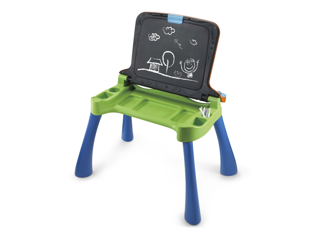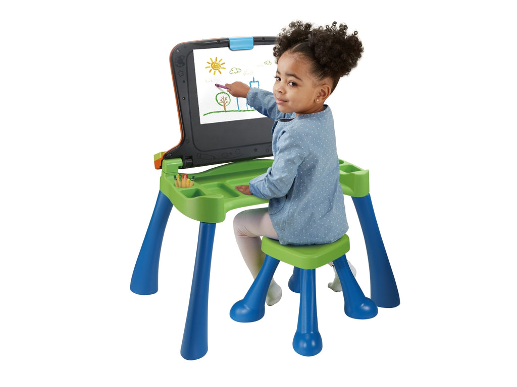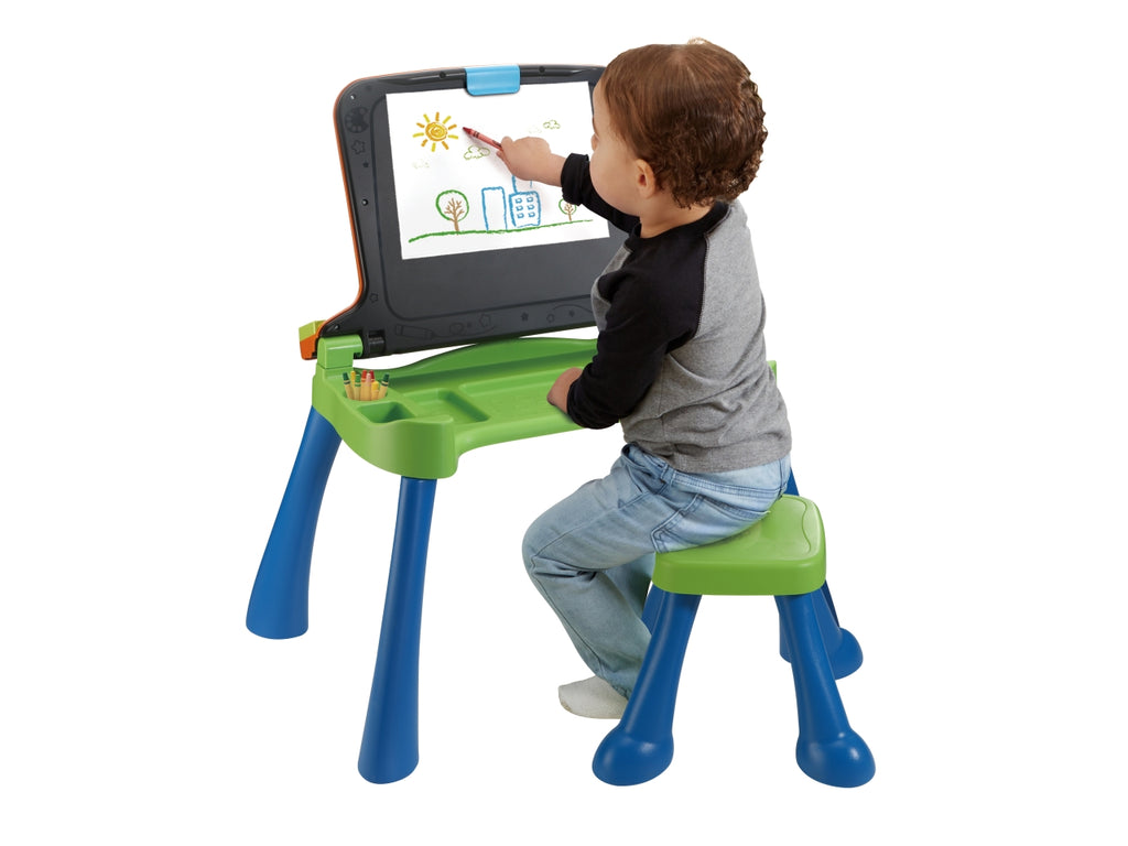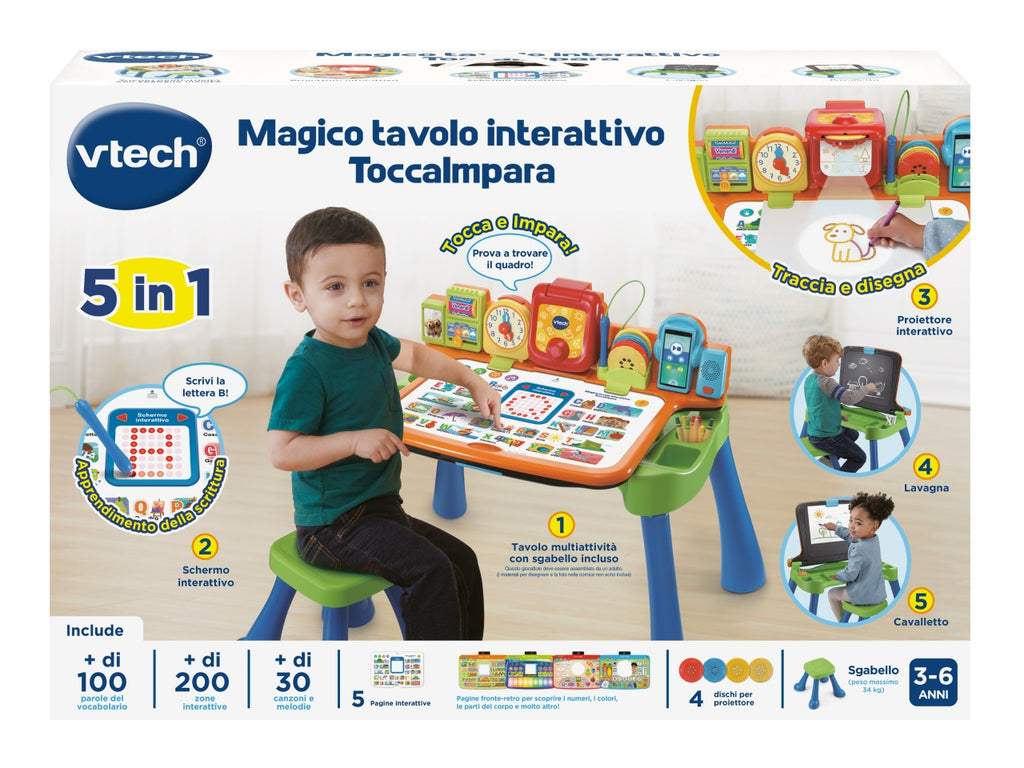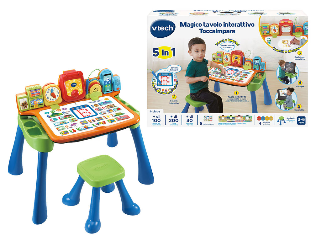⢠4 dischi inclusi per proiettare 28 immagini divertenti e per imparare a disegnare! ⢠Funzione scrivania: schermo interattivo per imparare a scrivere lettere e numeri, lettore musicale, orologio, calendario, cornice per personalizzare il proprio spazio di lavoro, 4 schede interattive e tattili per scoprire diversi temi - lâalfabeto, i numeri, le parti del corpo, i vestiti, gli strumenti, ecc. ⢠Funzione scrittura: utilizzando lo schermo, i bambini imparano a scrivere lettere e numeri seguendo le linee tracciate dai LED luminosi. Lo penna in dotazione viene riconosciuta dallo schermo e guida il bambino nel suo processo di apprendimento. ⢠Cavalletto: per appendere i fogli da disegno e dare libero sfogo al proprio talento artistico. ⢠Lavagna: per disegnare con i gessetti (non inclusi) o giocare a fare il maestro o la maestra. ⢠Le voci e le animazioni sullo schermo si attivano quando il bambino tocca le schede interattive. ⢠4 schede interattive incluse che possono essere riposte allâinterno del tavolino. ⢠Portamatite/gessetti e sgabello inclusi. ⢠Regolazione del volume e spegnimento automatico.