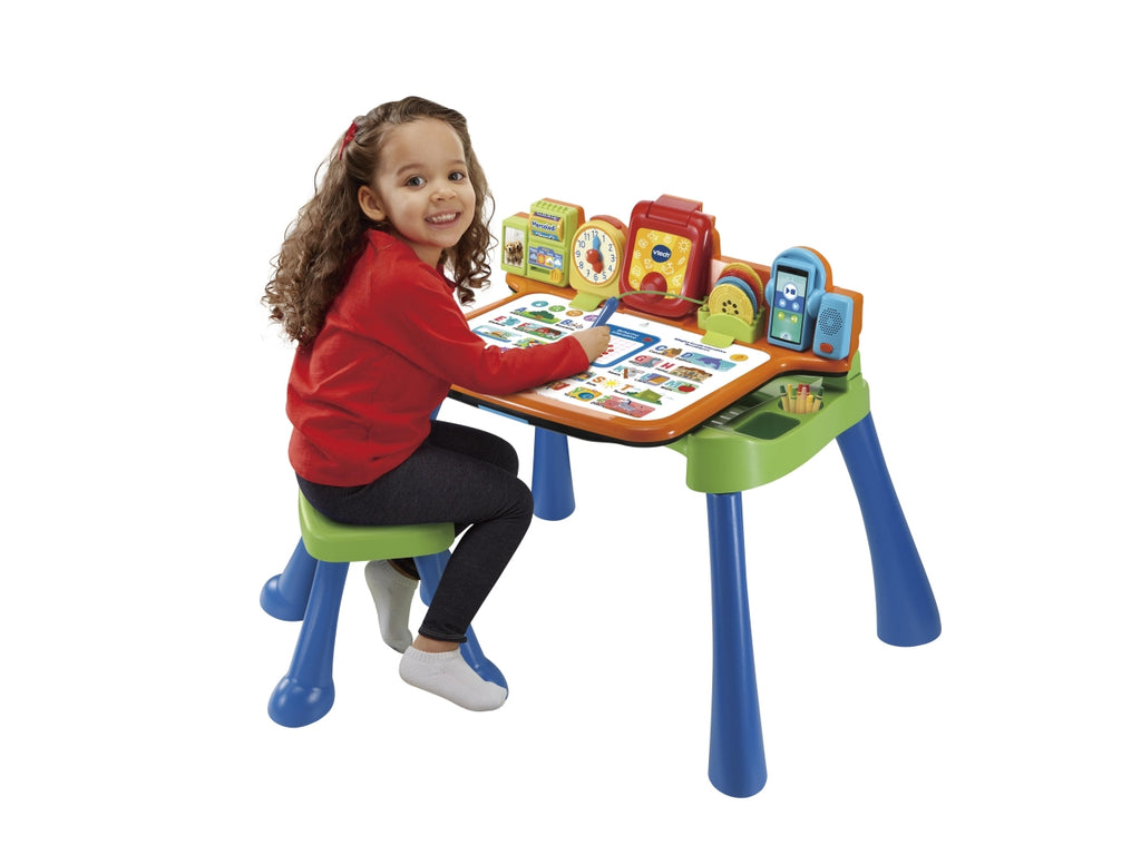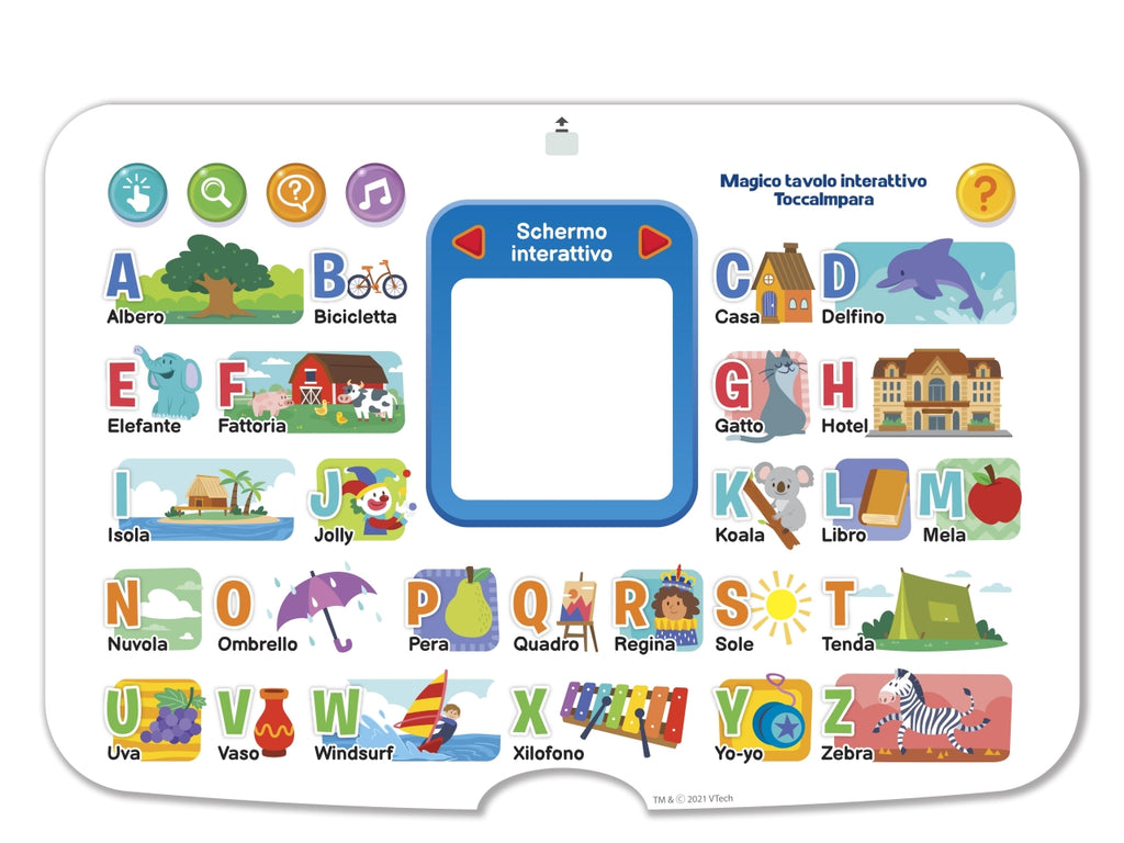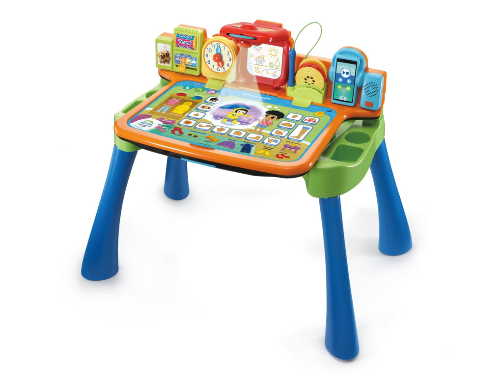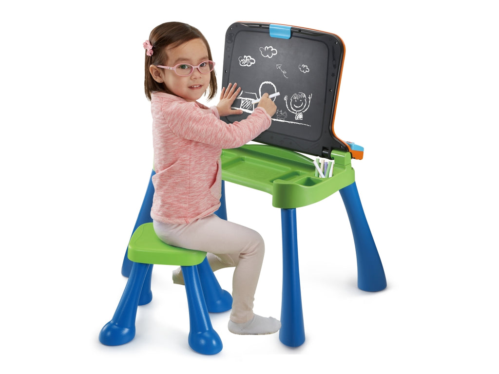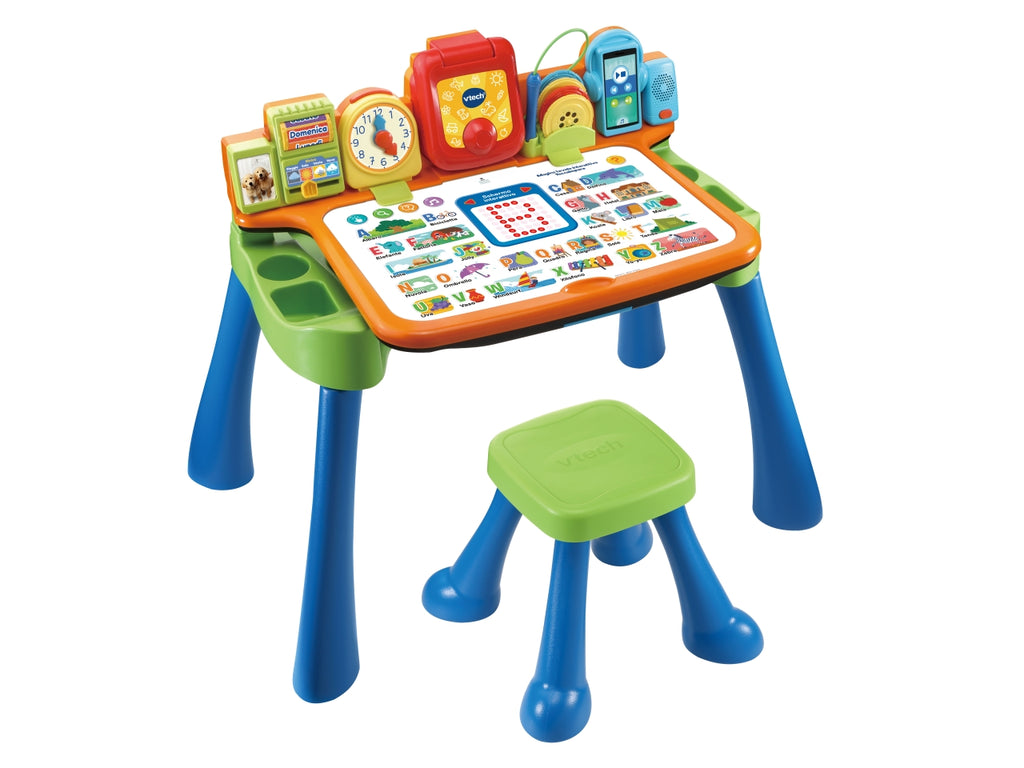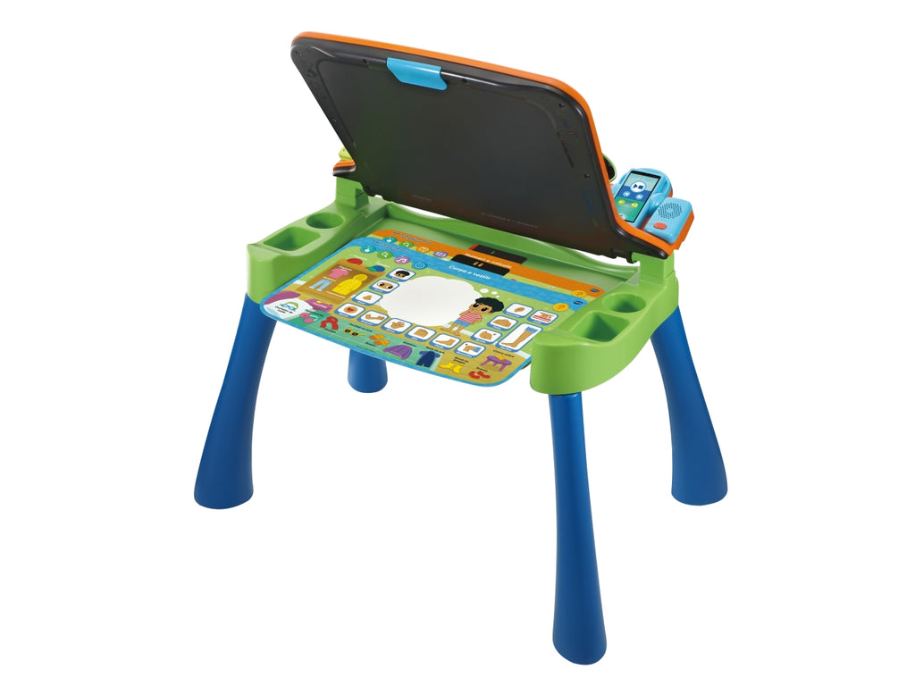 ⢠4 dischi inclusi per proiettare 28 immagini divertenti e per imparare a disegnare! ⢠Funzione scrivania: schermo interattivo per imparare a scrivere lettere e numeri, lettore musicale, orologio, calendario, cornice per personalizzare il proprio spazio di lavoro, 4 schede interattive e tattili per scoprire diversi temi - lâalfabeto, i numeri, le parti del corpo, i vestiti, gli strumenti, ecc. ⢠Funzione scrittura: utilizzando lo schermo, i bambini imparano a scrivere lettere e numeri seguendo le linee tracciate dai LED luminosi. Lo penna in dotazione viene riconosciuta dallo schermo e guida il bambino nel suo processo di apprendimento. ⢠Cavalletto: per appendere i fogli da disegno e dare libero sfogo al proprio talento artistico. ⢠Lavagna: per disegnare con i gessetti (non inclusi) o giocare a fare il maestro o la maestra. ⢠Le voci e le animazioni sullo schermo si attivano quando il bambino tocca le schede interattive. ⢠4 schede interattive incluse che possono essere riposte allâinterno del tavolino. ⢠Portamatite/gessetti e sgabello inclusi. ⢠Regolazione del volume e spegnimento automatico.
