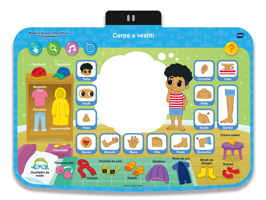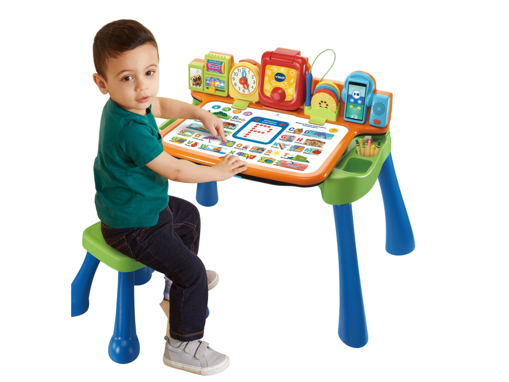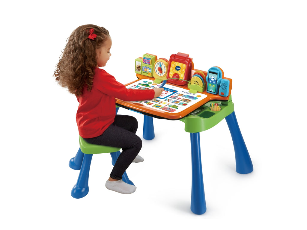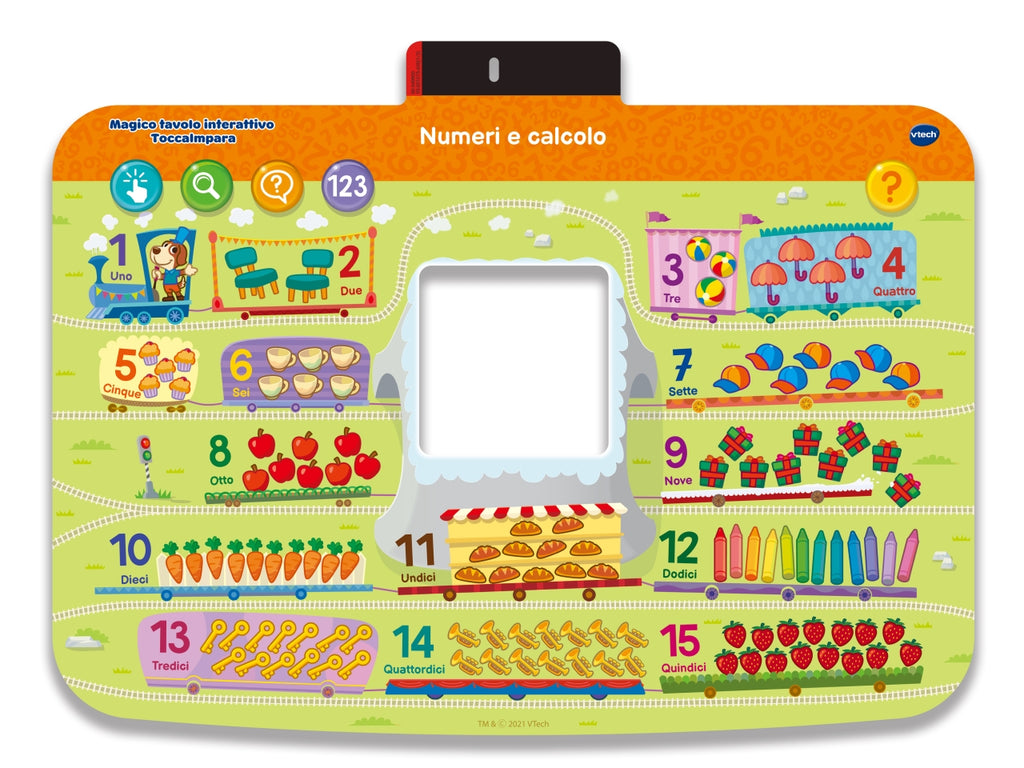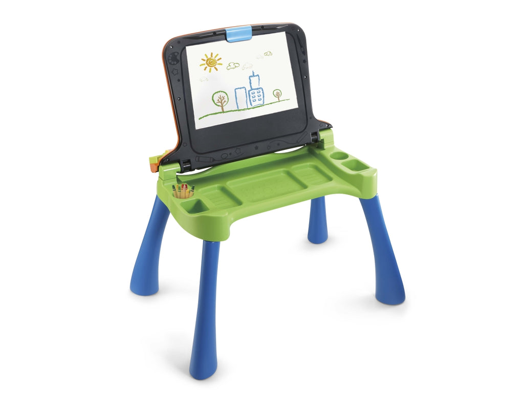 ⢠4 dischi inclusi per proiettare 28 immagini divertenti e per imparare a disegnare! ⢠Funzione scrivania: schermo interattivo per imparare a scrivere lettere e numeri, lettore musicale, orologio, calendario, cornice per personalizzare il proprio spazio di lavoro, 4 schede interattive e tattili per scoprire diversi temi - lâalfabeto, i numeri, le parti del corpo, i vestiti, gli strumenti, ecc. ⢠Funzione scrittura: utilizzando lo schermo, i bambini imparano a scrivere lettere e numeri seguendo le linee tracciate dai LED luminosi. Lo penna in dotazione viene riconosciuta dallo schermo e guida il bambino nel suo processo di apprendimento. ⢠Cavalletto: per appendere i fogli da disegno e dare libero sfogo al proprio talento artistico. ⢠Lavagna: per disegnare con i gessetti (non inclusi) o giocare a fare il maestro o la maestra. ⢠Le voci e le animazioni sullo schermo si attivano quando il bambino tocca le schede interattive. ⢠4 schede interattive incluse che possono essere riposte allâinterno del tavolino. ⢠Portamatite/gessetti e sgabello inclusi. ⢠Regolazione del volume e spegnimento automatico.
