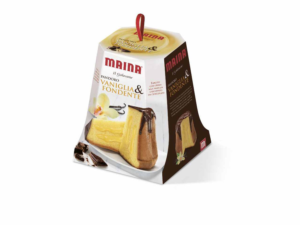 Pandoro vaniglia & fondentevaniglia e cioccolato: doppia tentazioneall'esterno un'irresistibile e croccante glassa al cioccolato fondente, all'interno un soffice cuore di deliziosa crema alla vaniglia avvolto in un impasto soffice e profumato, lievitato naturalmente per oltre dieci ore.