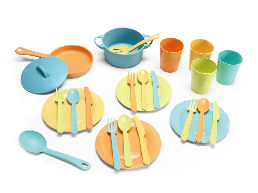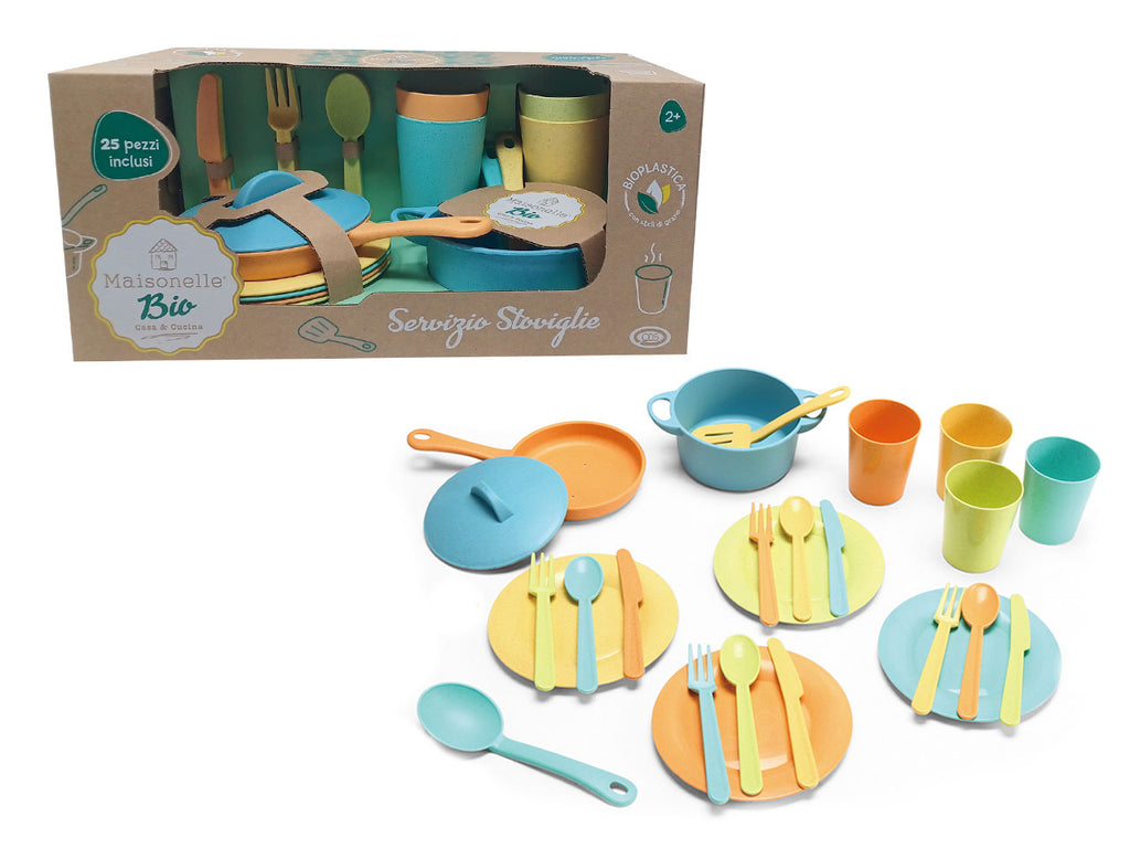 Il "Servizio Stoviglie" di Maisonelle Bio è un set di gioco sostenibile composto da 25 pezzi, realizzato in bioplastica con fibre naturali di grano, perfetto per sensibilizzare i più piccoli allâecologia fin dai primi anni. Il set include una varietà di stoviglie come pentole, padelle, bicchieri, piatti e posate, tutti dai colori vivaci e dal design adatto ai bambini. Questo servizio è ideale per giochi di ruolo e stimola la creatività , rendendo i bambini partecipi in modo divertente e sicuro. Adatto dai 2 anni in su, rappresenta un'alternativa ecologica per il gioco quotidiano.
