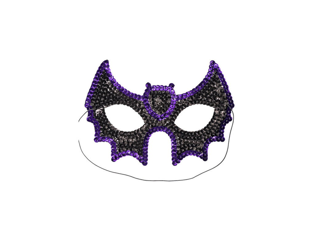 Maschera mezzo viso in tessuto ricoperto da paillettes nere e viola, che raffigura un pipistrello. Accessorio per completare un travestimento Halloween.