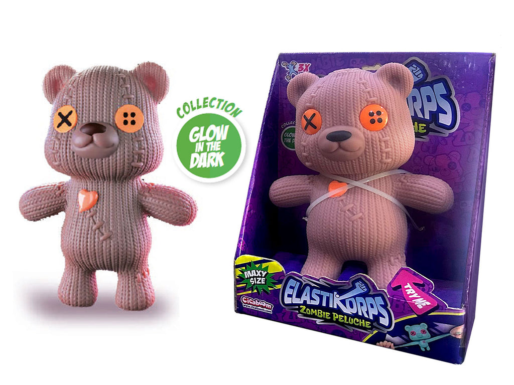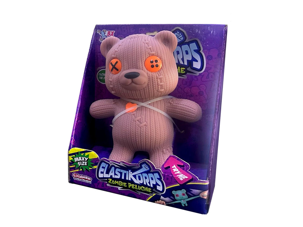 Maxi Killbear è il peluche zombie più stravagante della linea Elastikorps, un personaggio originale che combina dolcezza e mistero. Questo orsetto marrone è realizzato in materiale super elastico, che gli consente di essere allungato fino a tre volte la sua dimensione originale, per poi tornare sempre alla sua forma iniziale. Con dettagli unici come gli occhi arancioni ricamati â uno a forma di "X" e l'altro con un bottone â e il cuore arancione sul petto, Killbear cattura l'attenzione con il suo stile inconfondibile. La funzione Glow in the Dark aggiunge un tocco magico, illuminandolo al buio per creare momenti di gioco ancora più sorprendenti. Il materiale morbido e flessibile lo rende ideale per essere schiacciato, tirato e coccolato. La confezione interattiva permette di provare subito la sua elasticità , rendendolo un regalo perfetto per i bambini che amano i giocattoli divertenti e fuori dagli schemi. Maxi Killbear è un compagno di avventure indimenticabile, pronto a portare fantasia e originalità in ogni momento di gioco.