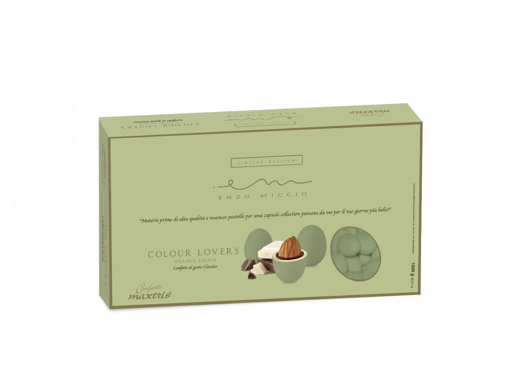 Da Enzo Miccio arriva una collezione esclusiva dai colori pastello molto eleganti e delicati. L'Enzo Miccio Nuance Salvia è costituito da una mandorla tostata ricoperta da cioccolato bianco e fondente e da un sottilissimo strato di zucchero.