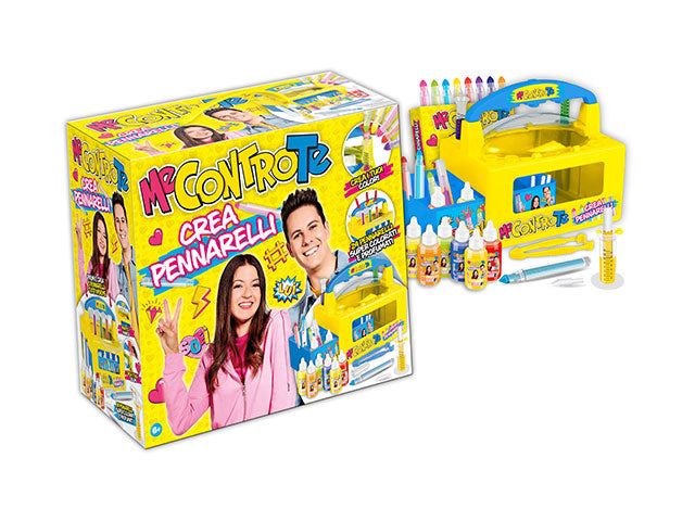 Con questo laboratorio Me Contro Te potrai creare pennarelli colorati! La confezione contiene tutto il necessario per realizzare 24 pennarelli di vari colori: - 1 macchina crea pennarelli - 6 inchiostri (3 standard, 3 fluo) - 24 pennarelli (filtri, tappi, coperchi, punte e adesivi) - 3 contenitori da 8 pennarelli ciascuno - becker - pinza - fogli da colorare - istruzioni per l'uso.