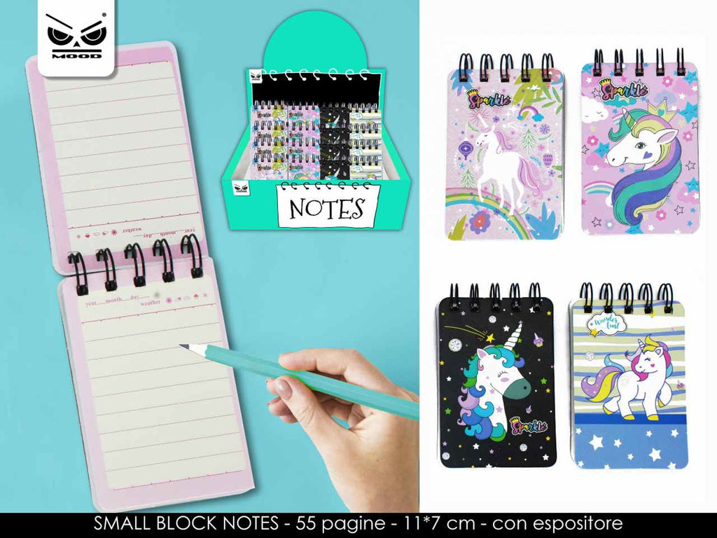 MINI BLOCK NOTES UNICORNO. 11x7 cm. 55 pagine a righe. In espositore.