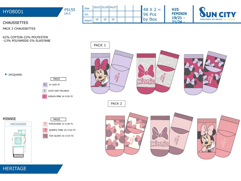 Minnie calzini dal 19/21 al 24/27 in confezione da 3 pezzi assortiti