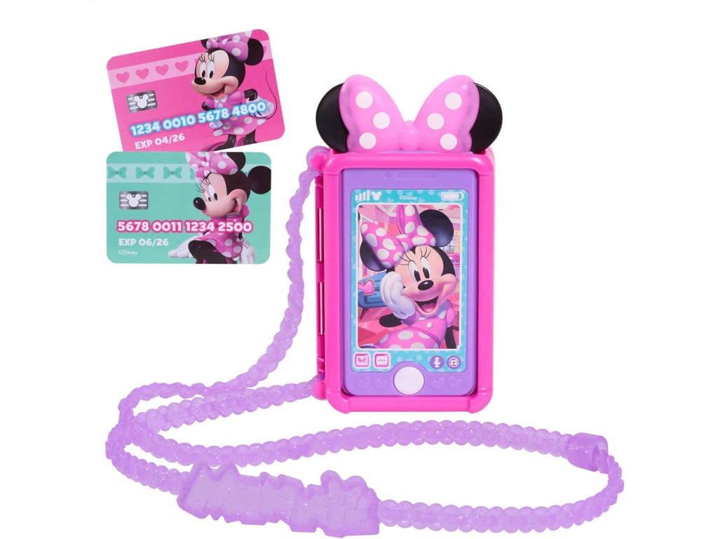 Il set cellulare con borsetta di Minni, con il suo iconico fiocco e le orecchie oversize che lo rendono immediatamente riconoscibile e divertente. All’interno sono incluse due carte di credito finte dedicate a Minni e un pratico taschino per riporle in modo ordinato. L’esperienza di gioco è resa ancora più coinvolgente grazie agli effetti luminosi e sonori realistici, che stimolano l’immaginazione e rendono ogni momento speciale. Grazie alla tracolla regolabile può essere portato comodamente ovunque, perfetto per divertirsi anche fuori casa. Funziona con 3 batterie AG13 già incluse nella confezione ed è adatto a bambi