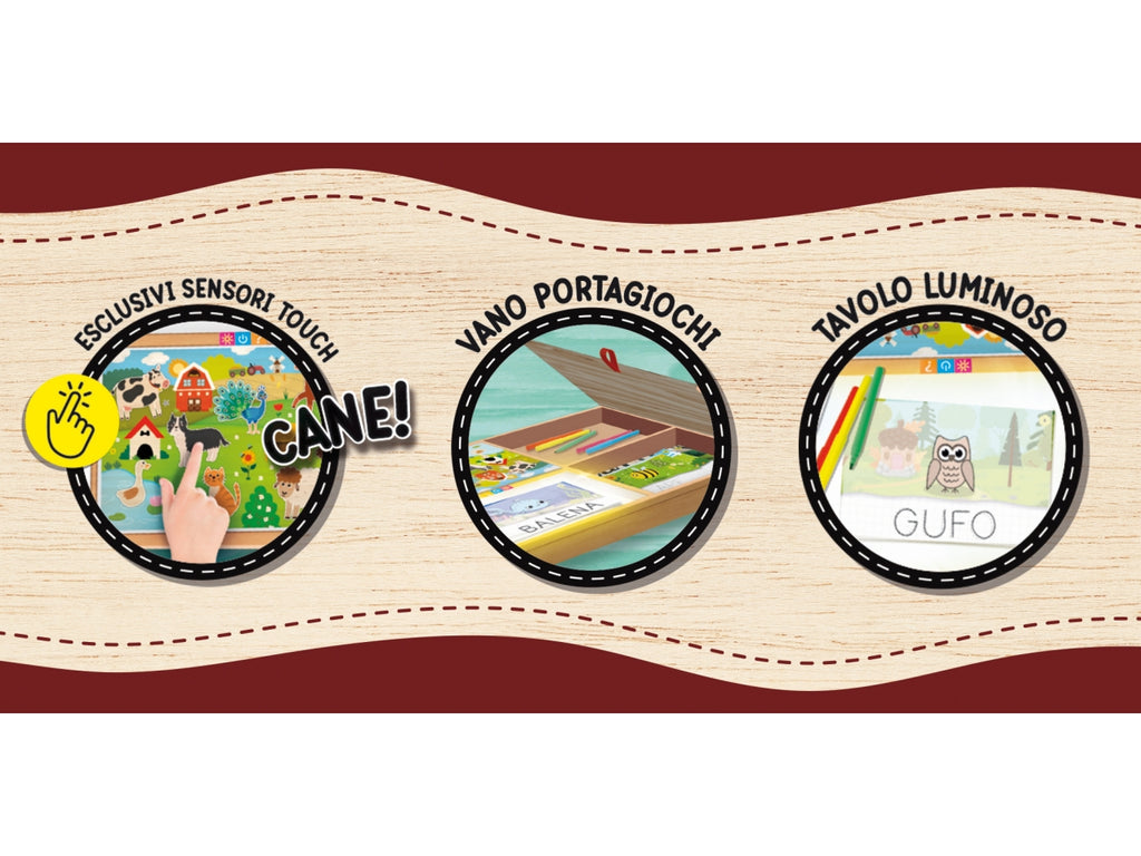 Un vero e proprio tavolo in legno a misura di bambino. Grazie agli esclusivi sensori touch, permette al bambino di ascoltare lettere e parole. Con una lavagna luminosa permette al bambino di imparare a scrivere e disegnare attraverso il metodo del ricalco. In più, il tavolo dispone di un pratico vano portagiochi!